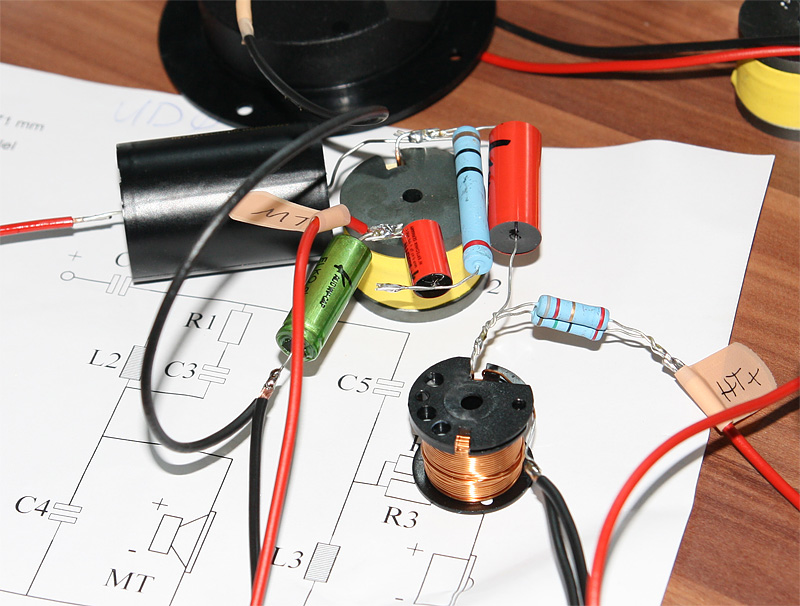 Ich habe den grünen Kap direkt an die kleine Spule (-) gelötet und den großen MKT ans Terminal geklebt und dort an Plus verlötet und mit der Zuleitung zur Weiche und dort an (+) der großen Spule. Dein Aufbau geht aber auch.