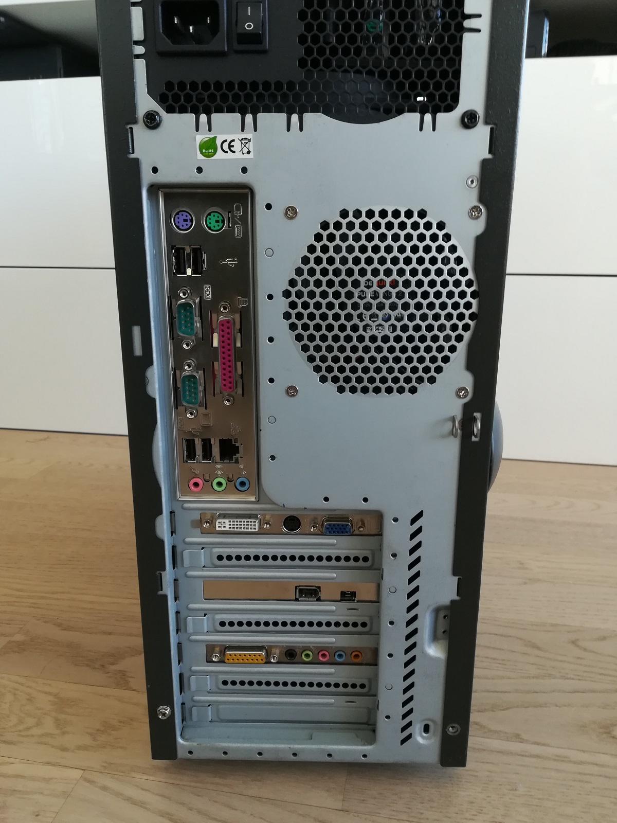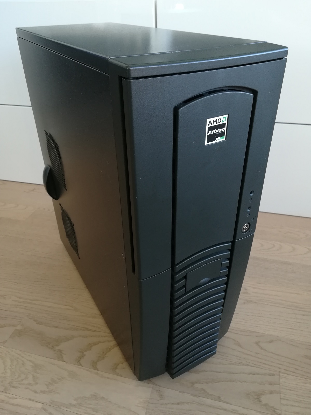 Das Gehäuse ist "mehr oder weniger" korrekt; es ist zwar DAS Gehäuse dieser Zeit (Chieftec CS-601 oder bekannt als "Dragon"), aber in einer späteren Revision mit größeren Lüftern und Frontpanel für USB und Audio. Ich habe es zusätzlich gedämmt. Vorne ein 120er Lüfter der ansaugt, hinten ein 92er der ausbläst sowie seitlich ein 92er der den Passivkühler der Grafikkarte belüftet. Der CPU Kühler ist ein Arctic Cooling mit Kupferbodenplatte und neuem 80er Lüfter.