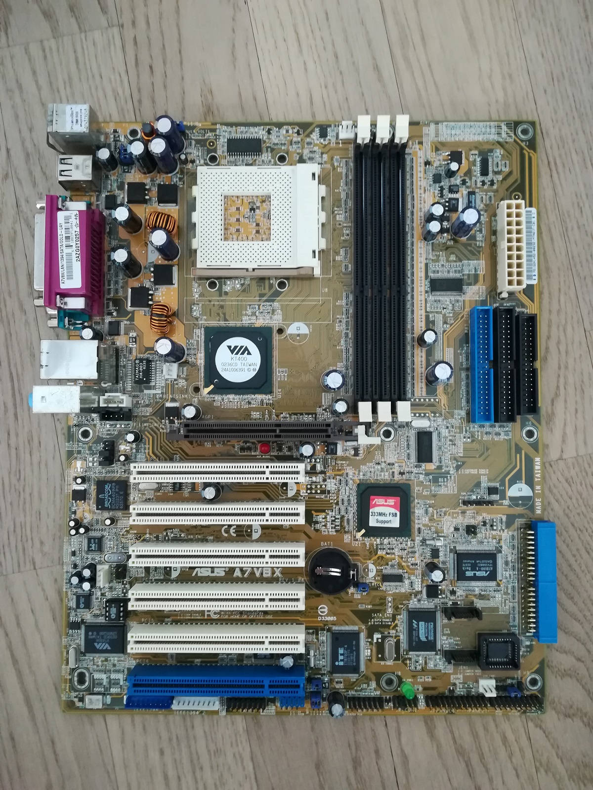 Mainboard: Asus A7V8X, KT400 (FSB 333), USB 2.0, Firewire, S-ATA, RAID, 100Mbit/s LAN, Sound 169€