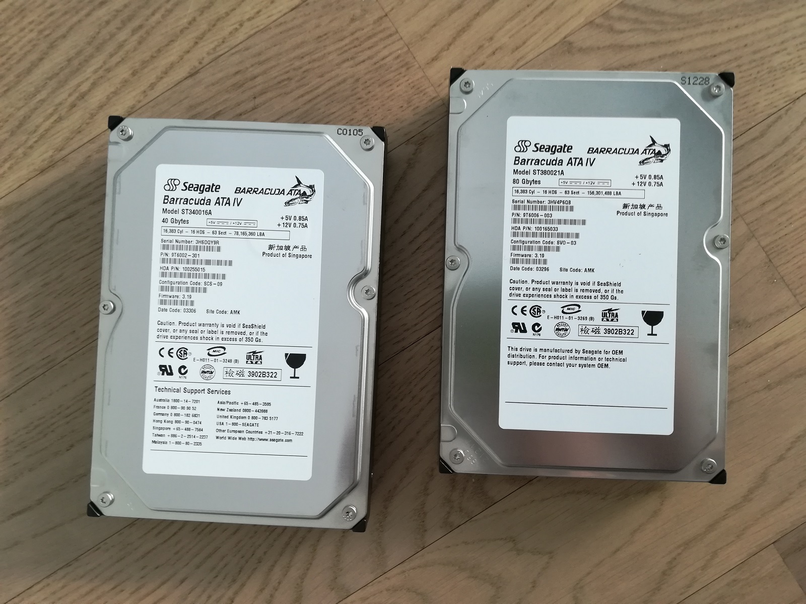 Die Festplatten sind klassische IDE Platten mit "aerodynamischen" Rundkabeln. Das Mainboard hat zwar auch S-ATA Anschlüsse (das erste überhaupt), aber es gab damals noch keine entsprechenden HDD auf dem Markt.