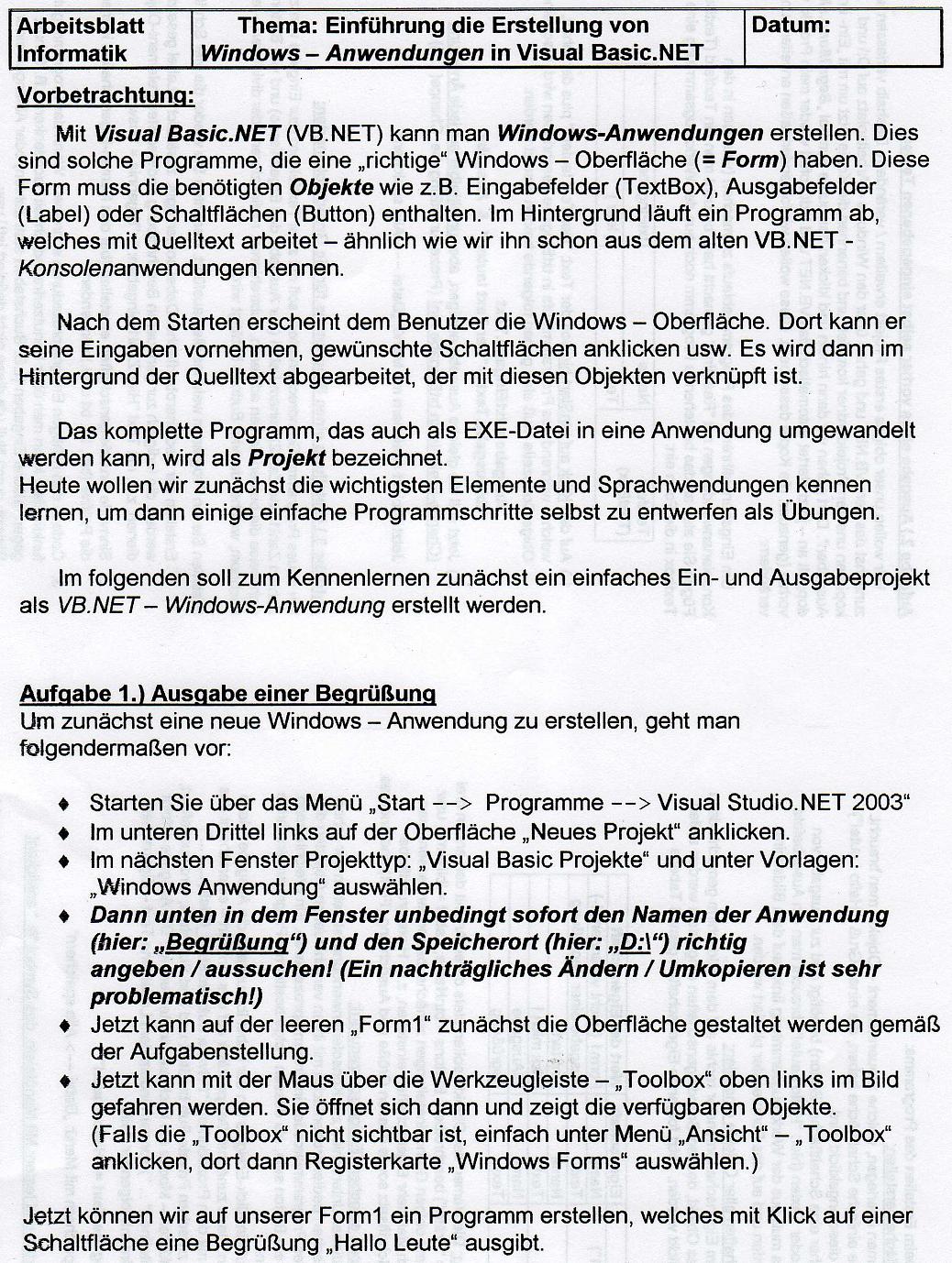 Wir haben vorletzte Woche Angefangen mit Windows Anwendungen Programmieren(davor mit Konsolen Anwendungen). Siehe Bild 1/2(Anfang WindowsAnwendungen).