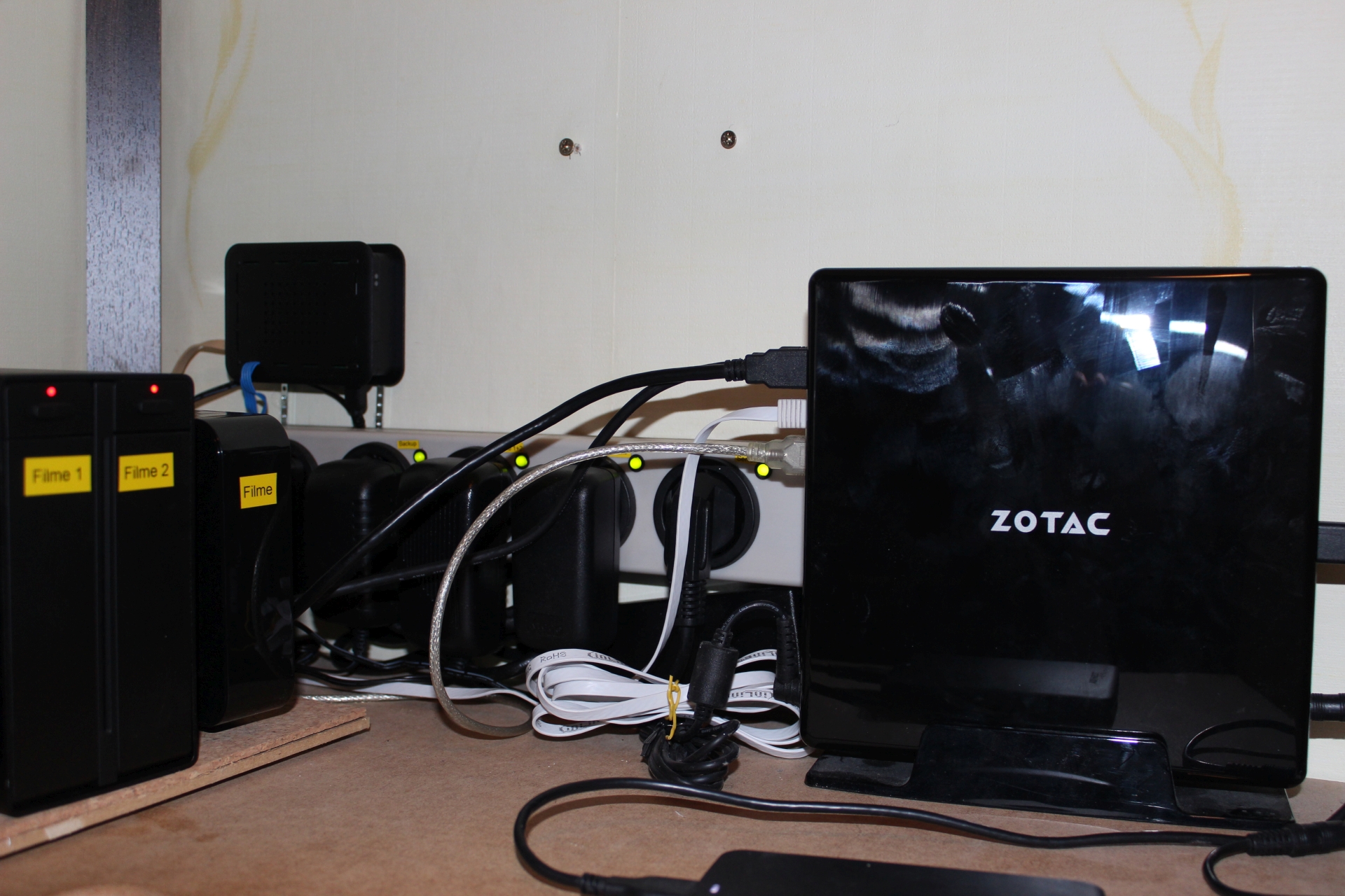 Ein von einem anderen Projekt übrig gebliebener Raspberry Pi brachte mich auf die Idee, die Steckdosenleiste meines kleinen Homeservers zu automatisieren. Der Server ist ein Zotac ID14, woran ich insgesamt 4 USB Festplatten in 3 externen Gehäusen angeschlossen habe. Im Zotac werkelt eine SSD, die noch in 2 Partitionen unterteilt ist (BS und Daten).