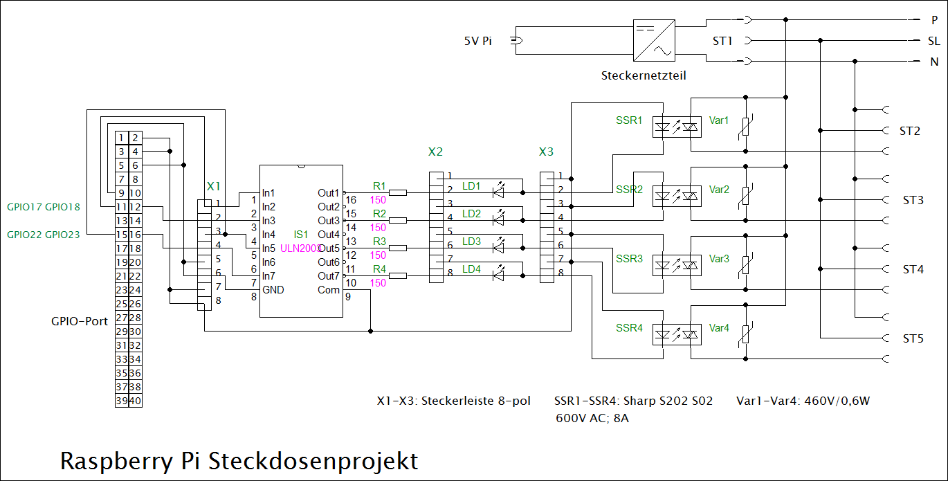 Klar war, dass ich insgesamt 4 Steckdosen schalten musste, also 4 GPIOs des Pi belegt werden. Eine Steckdose hängt direkt an 230V. Dort ist das Steckernetzteil für den Pi angeschlossen.