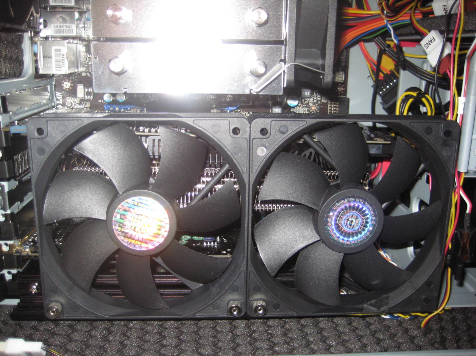 die 2 lüfter sind 12cm / 840 U/min von coolermaster und waren ursprünglich die gehäuselüfter von meinem sileo 500.