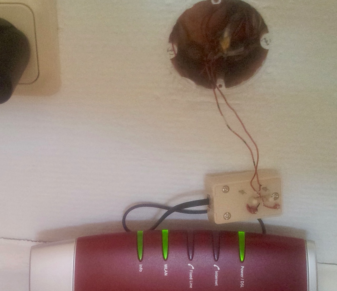 ich bin in eine neue Wohnung gezogen und habe dabei festgestellt, daß für den DSL-Anschluß noch keine TAE-Anschlußdose an der Wand ist (es ragen nur zwei Kabel aus der entsprechenden Öffnung an der Wand). Um zumindest provisorisch einen Internetanschluß zu bekommen (die Leitung ist bereits freigeschaltet), habe ich die zwei Kabelenden mit zwei Metallenden eines alten Telefonsteckers verbunden, von dem ein Kabel zum DSL-Splitter und von dort zum FritzBox DSL-Router geht.