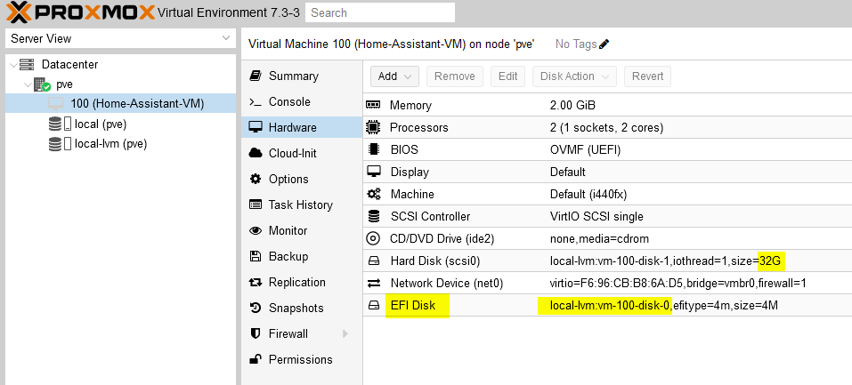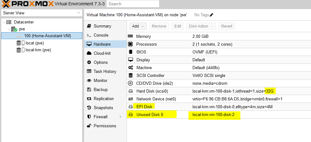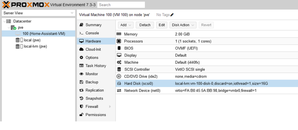- Installation von HomeAssistant als VM gemäß https://simplecloudbox.com/home-assistant-os-proxmox-7-vm