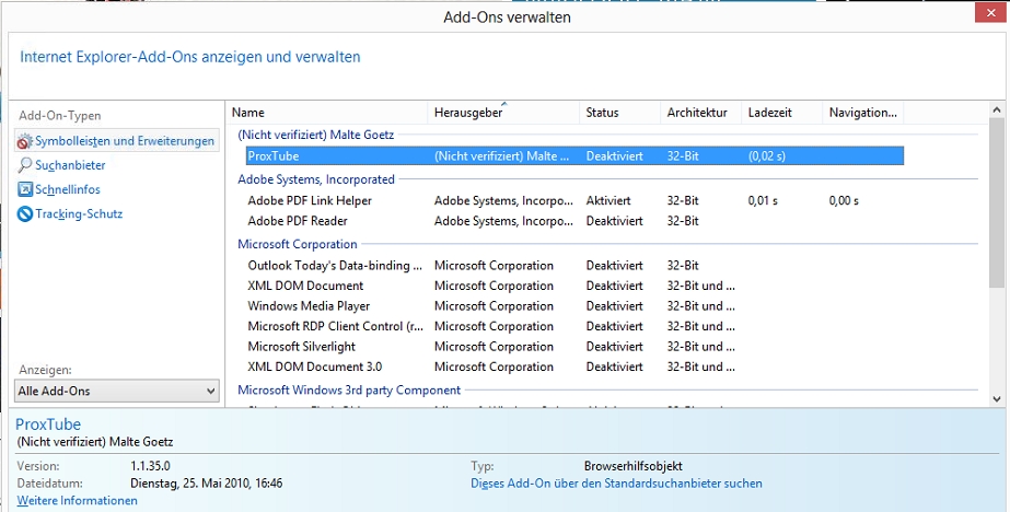 Das Ende vom Lied ist für mich seine AddOn-Liste im IE, dort steht ein ProxTube drin, siehe Anhang.