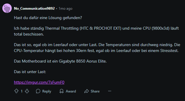 Ich habe bereits : neuste Treiber installiert, Windows neu installiert, Temperatur beobachtet während Cinebench R23 lief (war nie wärmer als 50 grad Celsius), PBO auf advanced gestellt, Energieoptionen geändert, Integrität der Kerne überprüft, Taktrate überprüft, im BIOS mit verschiedenen Einstellungen herumgespielt, Ryzen Master ausprobiert. Was mir jedoch aufgefallen ist, ist, dass der Stromverbrauch in Watt laut HWinfo64 nie über 60W war. Mehr ist mir nicht aufgefallen. Und ich habe auch schon fast alle Lösungsvorschläge von ähnlichen fällen im Internet ausprobiert und auch Lösungsvorschläge von ChatGPT ausprobiert. Ich bin echt frustriert.