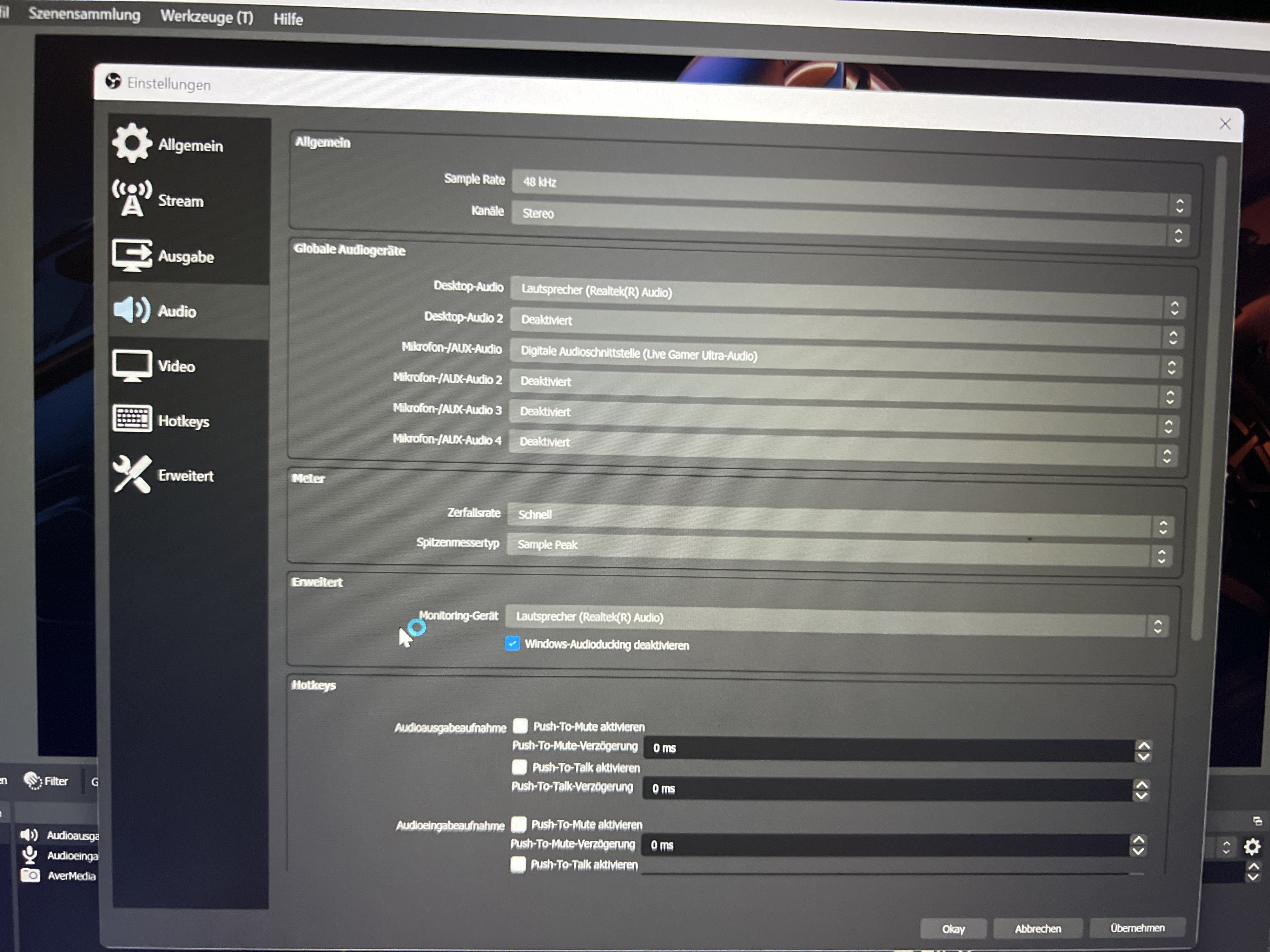 In den Einstellungen bzw. Eigenschaften der Capture Card habe ich schon „erweiterte Audio…“ die LiveGamer ausgewählt.