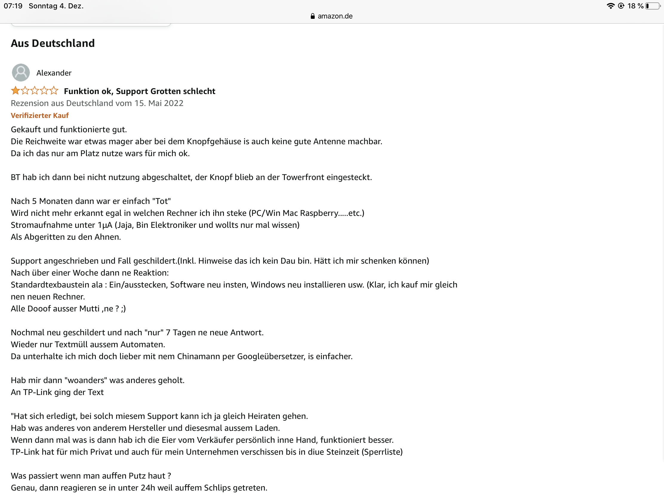 Im BT Menü nur noch gekoppelt gestanden, Gerät entfernt da eh nichts mehr ging und danach konnte ich ihn nicht neu verbinden. Weder normal durch drücken der PS Taste noch durch neu verbinden via PS Taste + Share Button gedrückt halten. Er taucht beim Versuch auf aber es heißt immer das Gerät würde nicht antworten.