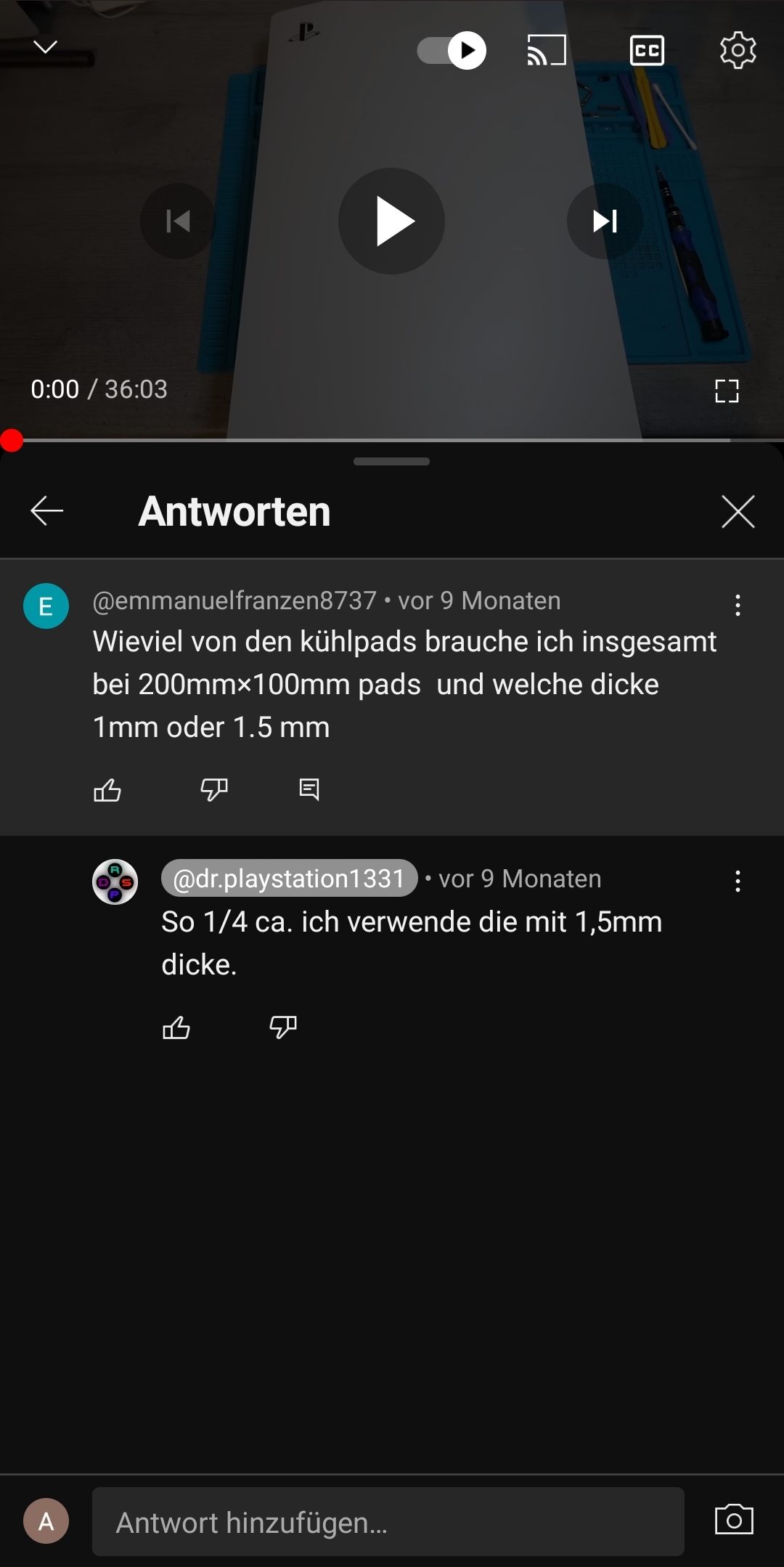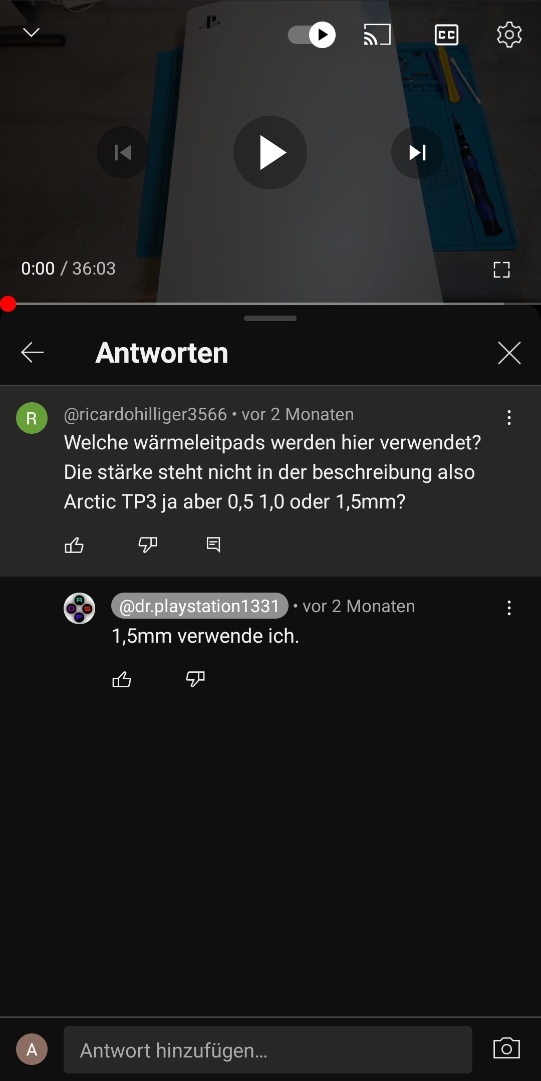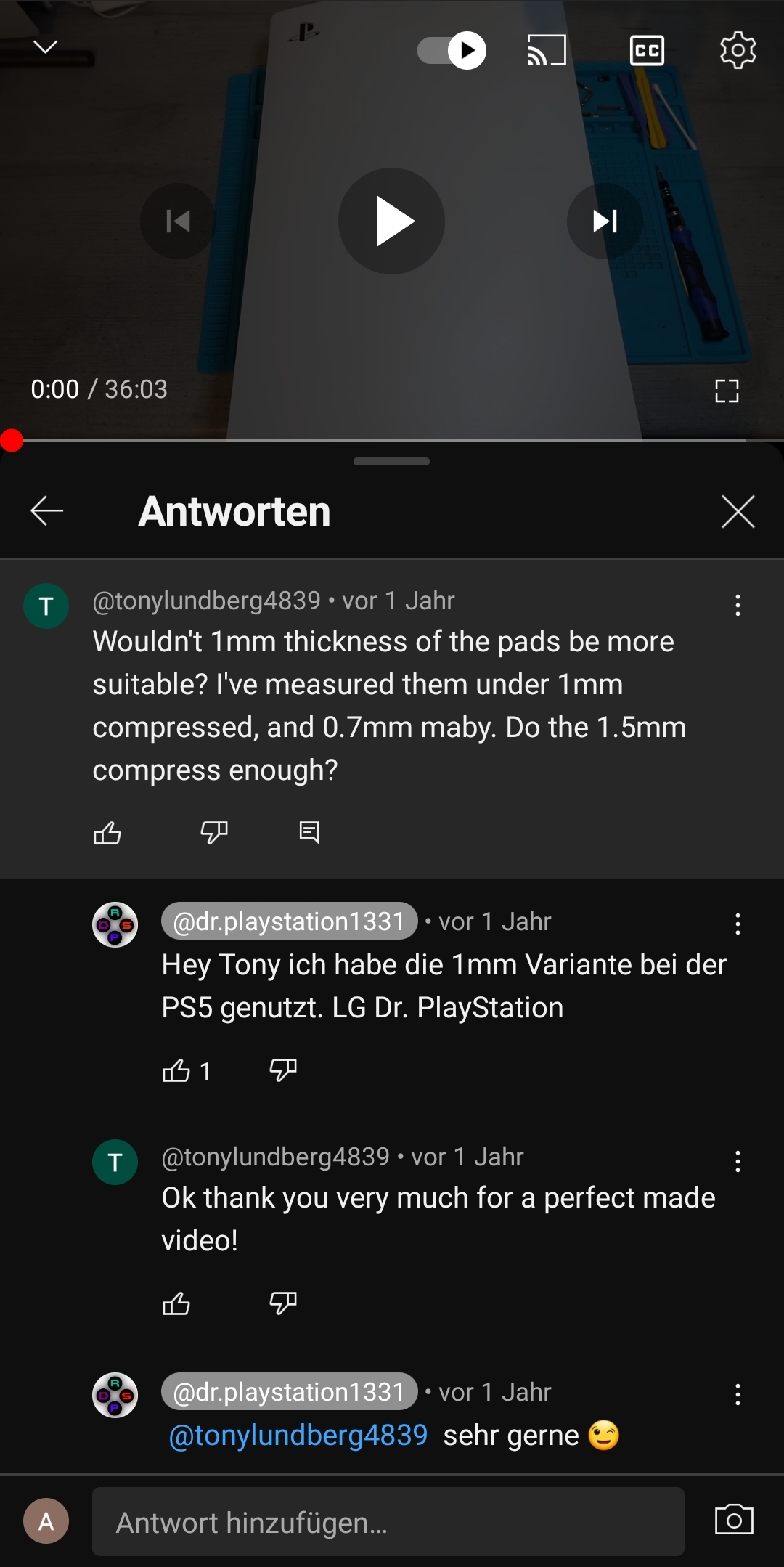 Ich kann mir aktuell nur sporadisch Videos in YouTube ansehen, weil ich Datenvolumen sparen muss und aktuell leider kein WLAN habe. Müsste aber jetzt schon bestellen, damit ich sie schnellstmöglich wieder zusammenbauen kann. Habe zwar noch bisschen was von den Arctic WLPpads mit 1,0mm Dicke da, aber in der Info zu einem Video wird nur 1,5mm verlinkt.