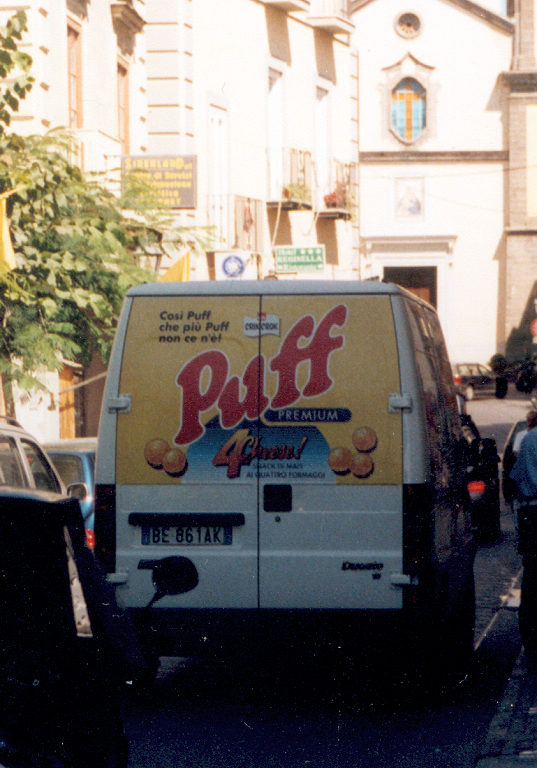 Zum Beweis - hier ein Foto von einem Puff-Lieferwagen! Die Aufschrift lautet: "Cosi Puff che più Puff non ce n'è!" - auf Deutsch: "So Puff, mehr Puff geht nicht!"