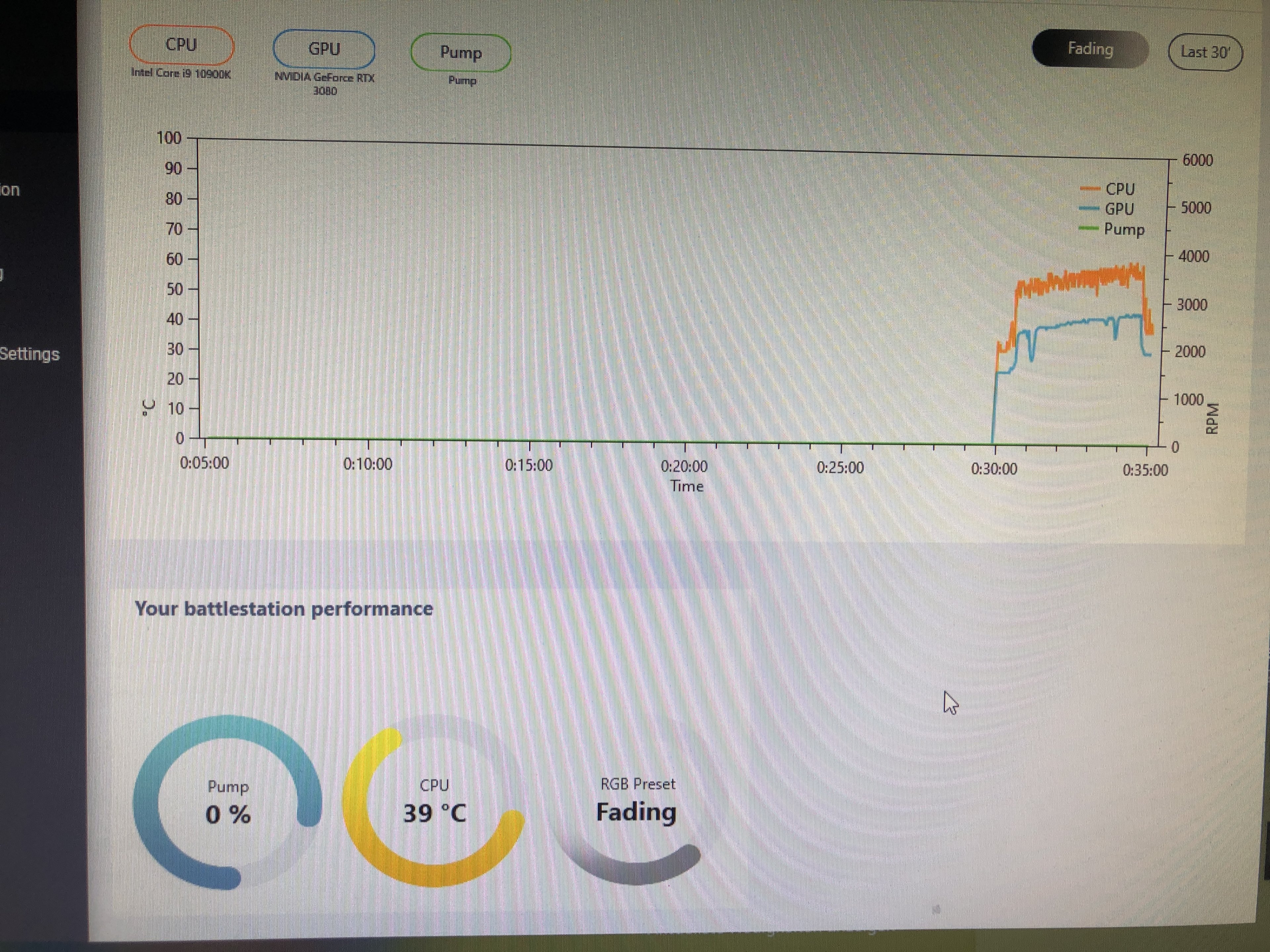 Etwas später habe ich den Computer neu gestartet, um zu schauen ob die LED's in ihrer ursprünglichen Farbe strahlen, tun sie beim Computer neu starten, aber bzw. allerdings nur die ersten 1 bis 2 Sekunden, danach wieder "signalton" rot(hier bin ich das erste mal in grübeln gekommen, ob wirklich noch alles funktioniert). Mittels Internet versucht ein paar Tipps zu bekommen, wie ich die LED's farblich verstellen kann. Einiges and Software geladen, jedoch alles erfolglos. Gelesen, das es ggf via BIOS verstellt werden kann. Dort kann ich alle Lüfter ansteuern, die Leistung einstellen, bei der Pumpe ging das jedoch nicht, dort stand das sie von sofort bei 100% läuft. (hier bin ich zum zweiten mal ins grübeln gekommen) Über eine andere Software ( "EK connect" ) wurde mir angezeigt welche Temperatur und vw. RPM meine CPU / GPU / Pumpe hat. Pumpenleistung bei 0 ! Dabei nochmal Cyberpunk2077 gestartet , 5 minuten gespielt. Temperatur von CPU GPU ist angestiegen, die RPM auch, nur bei der Pumpe blieb alles auf 0. Nach dem beenden des Spiels ist alles sofort wieder runter.