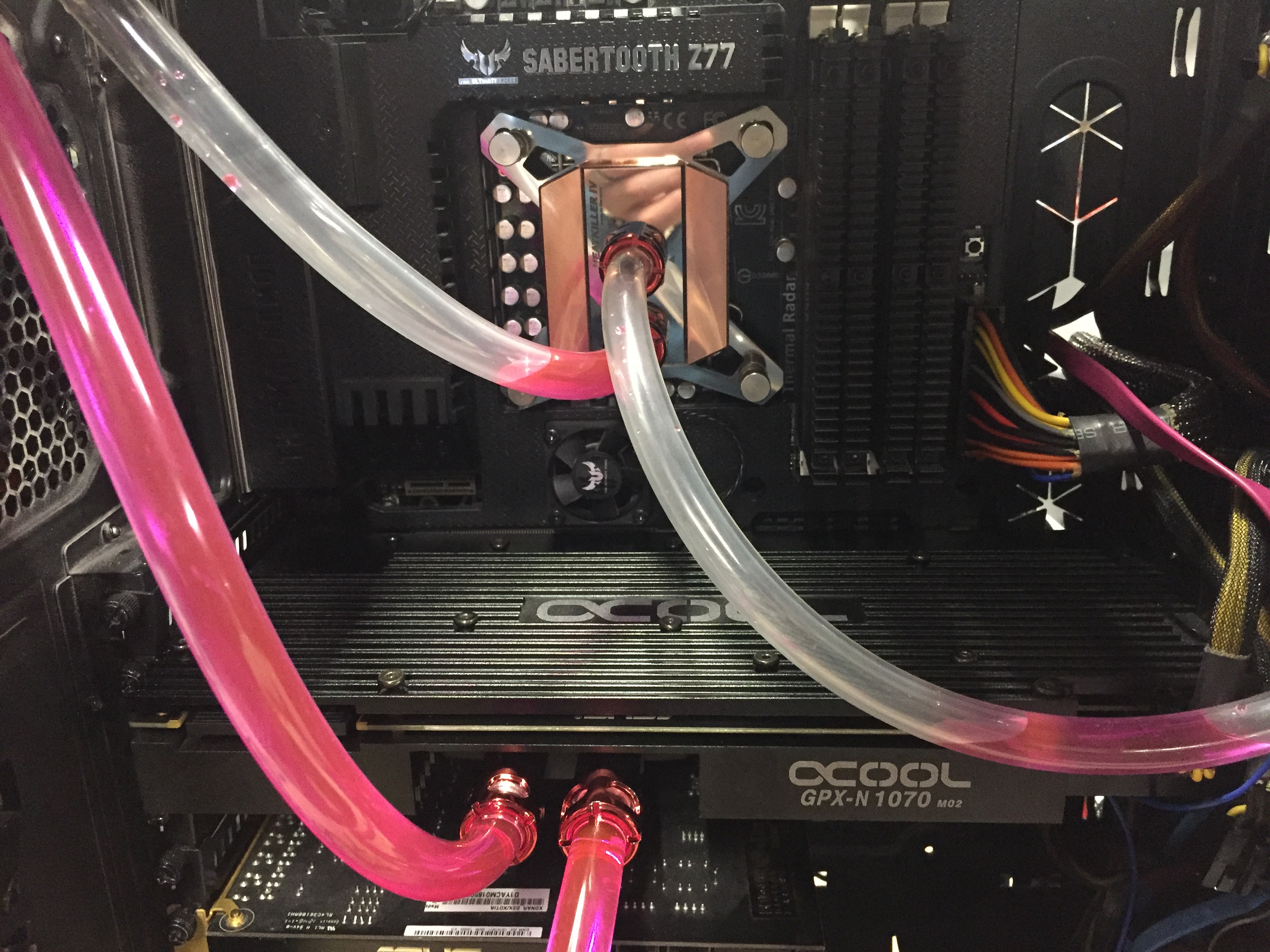 Die Pumpe führt zum CPU, dieser in den Radioator, dieser wiederum in die GPU und zurück zur Pumpe - Da Pumpe und AGB in einem sind schreibe ich nur "Pumpe".