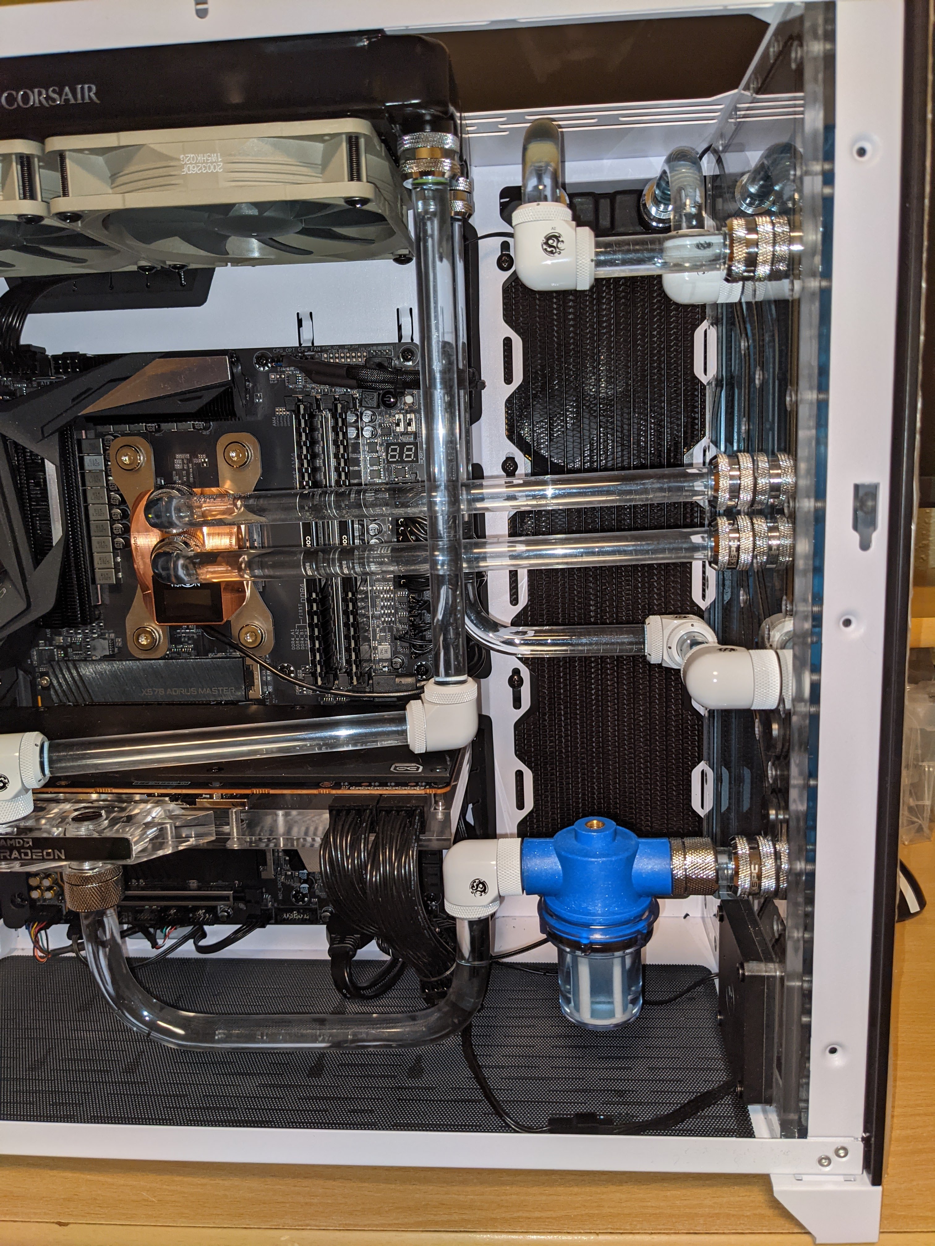 Ich habe mir einen neuen Rechner mit Wasserkühlung gebaut. Als Gehäuse dient ein O11DW Dynamic Midi-Tower, Tempered Glass. In die Gehäusefront habe ich eine Distro Plate vom Typ EK-Classic DP Front PC-O11D D-RGB + SPC PWM Distro Plate verbaut.
