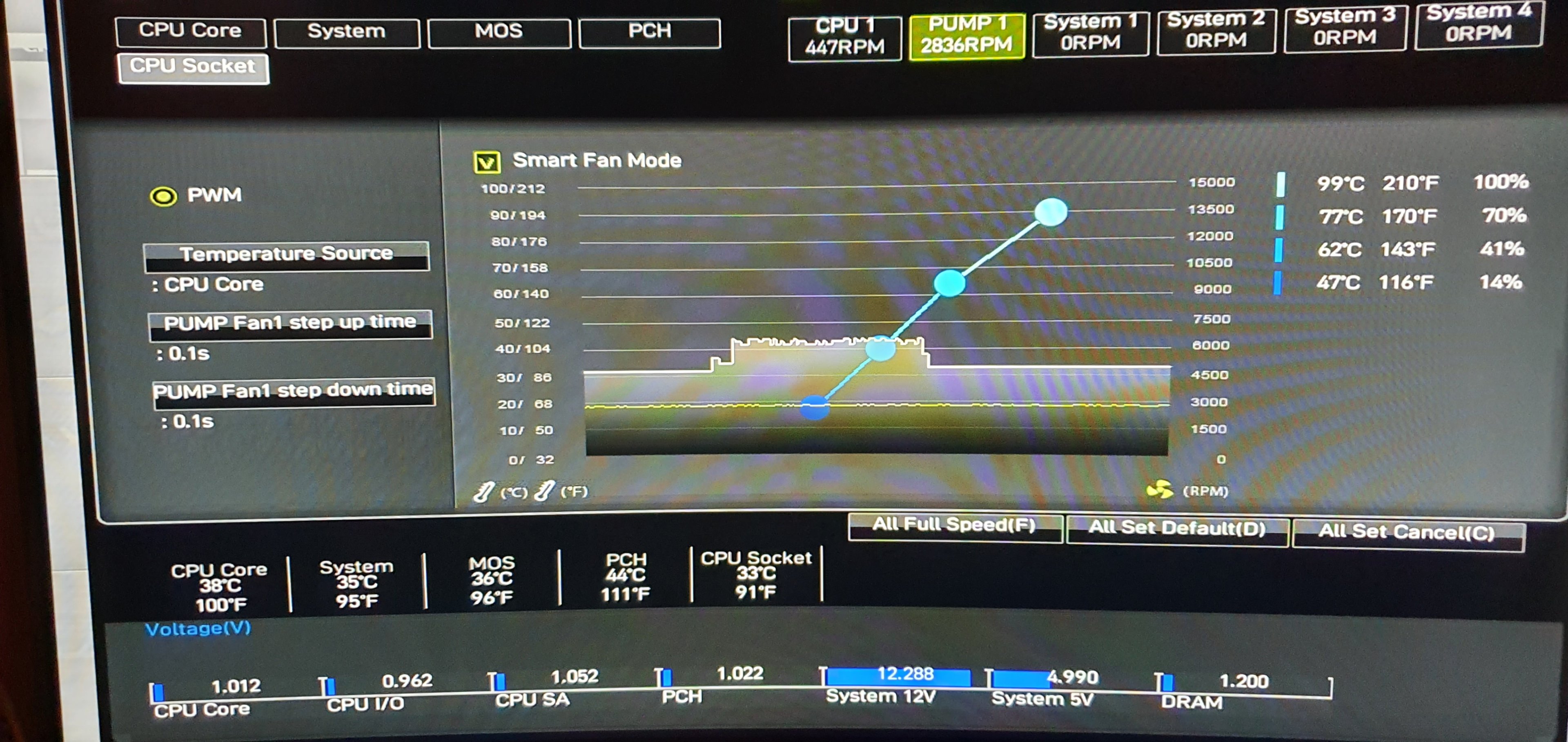 Kannst du mal bei Fan Control im Bios die anderen Reiter durchgehen wie CPU Core / System etc. ? Vielleicht kannst du da dann irgendwie DC einstellen, denn anders kannst du die Pumpengeschwindigkeit nicht ändern.