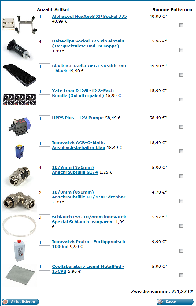 Luxmanl525 schrieb:Ein Wort dazu, daß du eine "Low-End Wakü" betreiben möchtest. Meiner Ansicht nach rechnet sich eine solche heutzutage nicht mehr, denn die heutigen Luft-Kühler sind solcher Art leistungsfähig, daß sie in jedem Fall mit einer "Low-End Wakü" mithalten können. Jedenfalls gilt das für Kühler vom Schlage eines Scythe Mugen oder Xigmatek HDT-S1283 und 963. Und die Kosten sind vergleichbar gering.