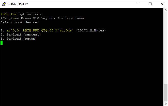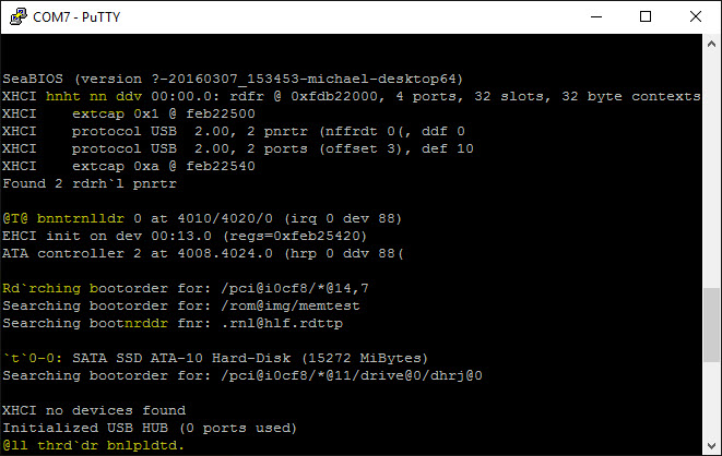 ich habe mir eine APU2C4 von PCEngines gekauft, um darauf eine Firewall zu installieren. Bei der Verbindung (mit USB2Serial) erscheinen im putty-Terminal-Fenster immer mal wieder komische Zeichen. Ich verwende die empfohlenen Verbindungsparameter 115200 8N1 (vgl. Screenshots). Ich habe es sowohl mit UTF8 als auch mit ISO8859-1:1998(Latin-1,West Europe) versucht. Trotzdem kann ich manchmal die Ausgabe im Terminal-Fenster kaum entziffern. Any idea ?