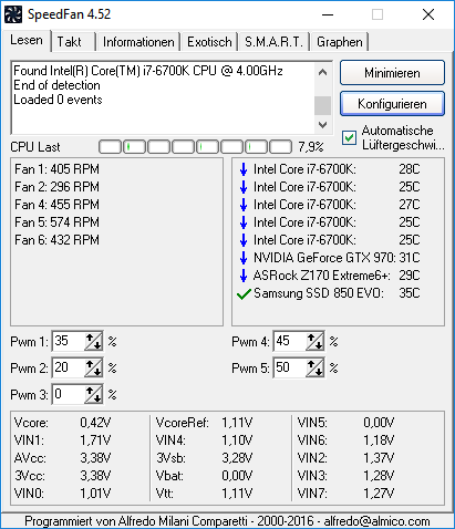 Der Tausch zwischen CHA_FAN4 (Sys Fan) und CPU_FAN2 (Aux Fan) klingt mir dann schon profitabler, dann wandert der DC/PWM-Hub des be quiet! Dark Base Pro 900 auf den schwachen Anschluss, denn Power braucht es dafür praktisch keine, aber ich bin nicht in Kenntnis, wie viel Power CPU_FAN1 (CPU Fan) und CPU_FAN2 (Aux Fan) sich bereitstellen. Da CPU_FAN2 (Aux Fan) sich per SpeedFan extern regeln lässt macht es Hoffnung, dass er nicht wie konventionell mit dem CPU_FAN1 (CPU Fan) gekoppelt ist, er also über seine eigene Leistung verfügt, nur wie viel ... Auch 1 Ampere? Von den Sparmaßnahmen auf den AMD-Brettern bin ich es gewohnt, dass die Anschlüsse so gekoppelt sind, dass sie sich einen Transistor teilen, der aber nicht die Power von zwei Transistoren aufbringt. Das muss ich berücksichtigen, weil an CPU_FAN1 (CPU Fan) die zwei be quiet! Silent Wings 3 MID-SPEED PWM [BQ SIW3 13525-MF PWM] @ 12V zerren. Ich habe schon einmal einen CPU_FAN2 beschädigt wegen Überlast durch jeweils zwei Lüfter pro CPU-Header, mit der Folge, dass die Regelung ausfiel, er also so nutzlos wurde wie ein sinnloser PWR-FAN, was ich schon einmal erwähnt habe.