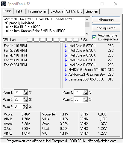 *Die beiden an CHA_FAN3 stören ohne verringerter Voltage mit Brummen. Das lässt sich aber vorerst nicht ändern - Ich brauche die gesamten 6 PWM-Low-Noise-Adapter für die fett markierten Lüfter. Zur Verfügung habe ich nur noch 3x 3-Pin-7V-Adapter von den Aerocool Shark Fans.)