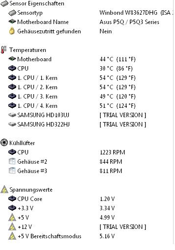 Nach Installation und einer Stunde Prime95 (4 Threads, alles 100% ausgelastet) ergeben sich folgende Temps: Kerne: 54 54 49 51 CPU: 30 (Everest Sreen siehe Anhang).
