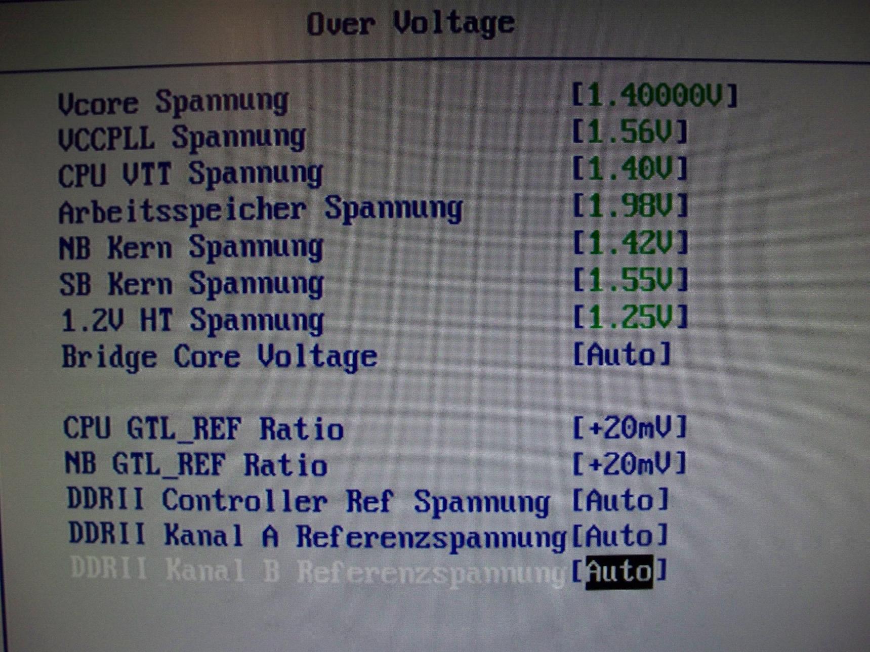 mit 1,4 V-core habe ich auch 3,2 zu laufen gehabt ,aber dazu müßten man noch mehr ändern, ist ja nur der Veruch die 2,69 zu knacken , und das sollte so hinhauen , denn diese 2,69 sind wirklich wie so eine Schallmauer bei dem Board mit der CPU .