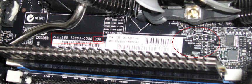Die Revisionsnummer steht zwischen Northbridge und Ram (siehe auch Bild im Anhang). Die Revisionen unterscheiden sich in ein paar Widerständen und in deren Anordnung (rechts rot eingekreist).