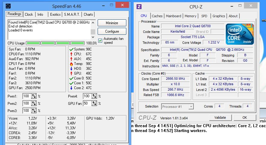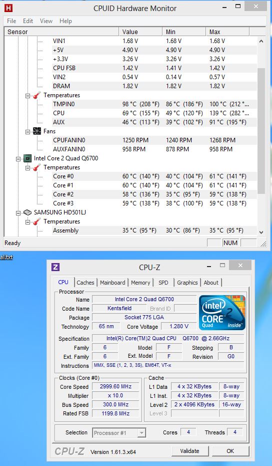 Die Temperaturen sind allerdings meiner Meinung nach überraschend hoch. Ich habe mal einen Screenshot von Speedfan und CPU-Z mit Standardtakt gemacht und würde gerne wissen, ob das normale Temperaturen bei diesem Kühler sind, oder ob ich nochmal WLP und Sitz des Kühlers überprüfen sollte (bei AS kann man nachlesen, dass die ArcticSilver 5 200 Stunden braucht, bis sie volle Leistung erreicht).