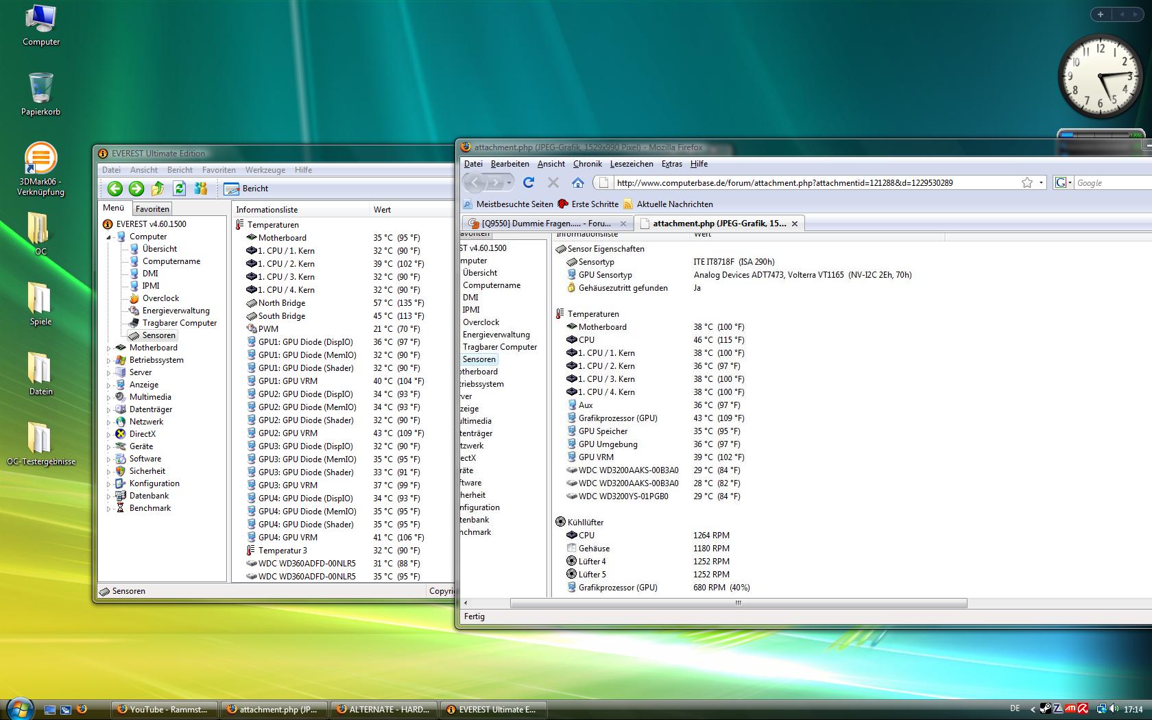 Ich habe einen Intel Core 2 Quad Q9550 im E0 Stepping (JUHU!!). Diesen habe ich jetzt mit einer spannung von 1,152 V und einem FSB von 400 auf 3,4 Ghz gebracht. Zur kühlung verwende ich einen Scythe Mugen mit Rotation Kit und einem Coolermaster 120 mm Sonic Green Lüfter. Die WLP ist neu, verwendent habe ich die Arctic Silver V. Die Temperatur der Cores bleibt mit dieser kombi im IDLE bei ca. 38°C was ich durchaus als gute Leistung erachte. Bei last gehts bis ca. 45°C hoch, auch noch ansehnlich. Nun zu meiner ersten Frage.
