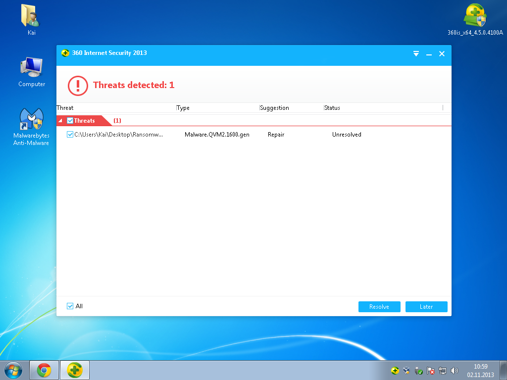 Neuste Version der Ransomware v176-02.11.2013 wird von Qihoo erkannt.