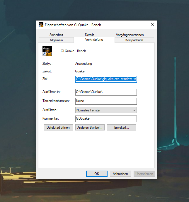 Jetzt werden die Verknüpfungen auf dem Desktop erstellt, einmal für GLQuake und einmal für WinQuake, danach unter Eigenschaften werden die Verknüpfungen noch mit den Befehlen für den Benchmark ausgestattet, siehe dazu den nächsten Punkt: "4. Zum Benchmark mit Quake (Teil 1)"