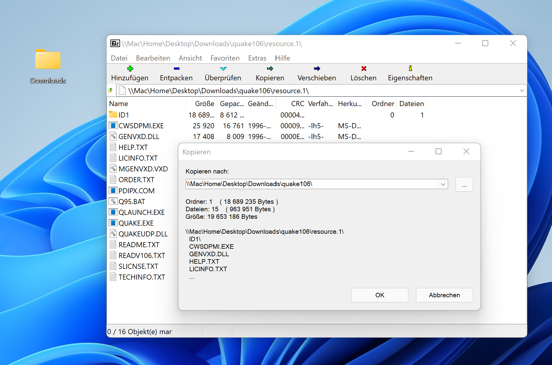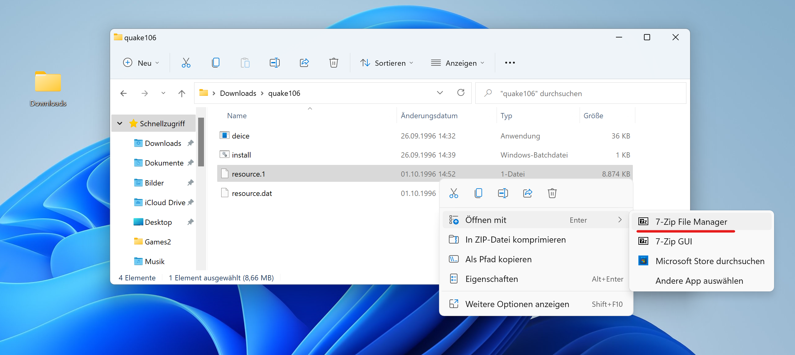 Nach dem Entpacken der Zip Datei (quake106.zip) finden wir vier Dateien vor, die "resources.1" entpacken wir in den gleichen Ordner mit 7-Zip. (siehe Bilder)