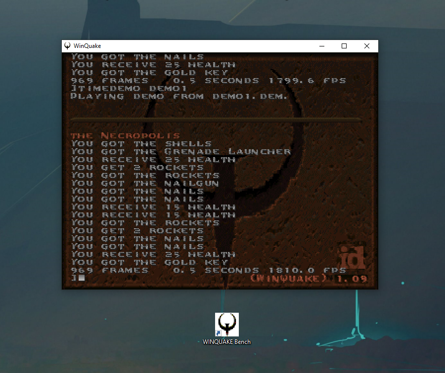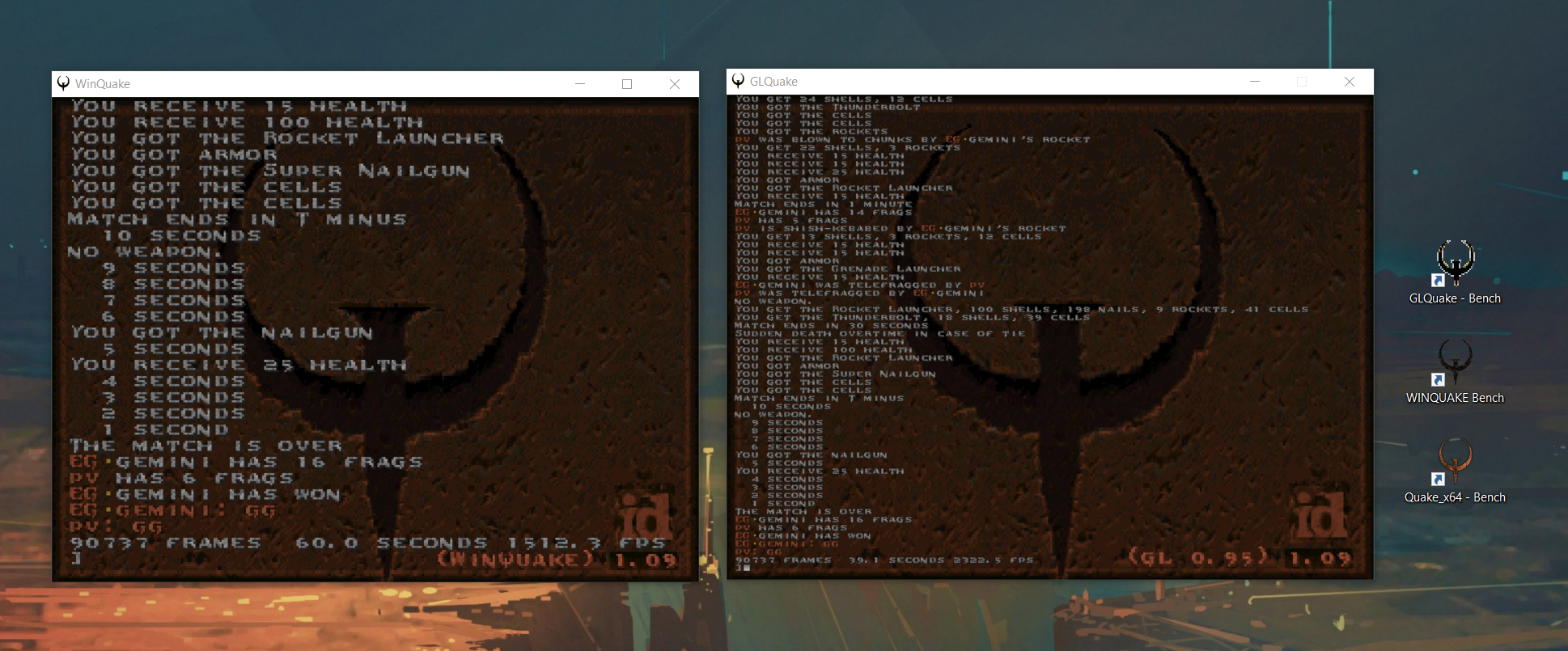 mehr oder weniger durch einen Zufall ist @andi_sco und mir aufgefallen das Quake (1) keine Framelimitierung hat. Da Quake (1) ab DOS 5.0 bis hin zu Windows 11 lauffähig ist, (auch unter Linux, ein Test dazu steht noch aus) möchte ich euch hier eine Möglichkeit bieten eure Quake (1) Benchmarks zu posten und oder zu Diskussionen anregen.