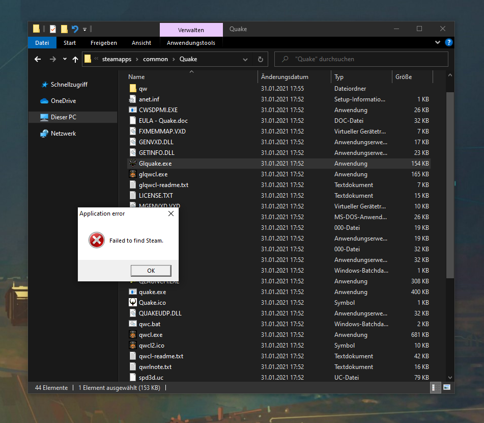Um dennoch ohne Steam Quake nutzen zu können, kopiert man die "wichtigsten" Dateien in einen neuen Ordner, hier z.B. Games\Quake.