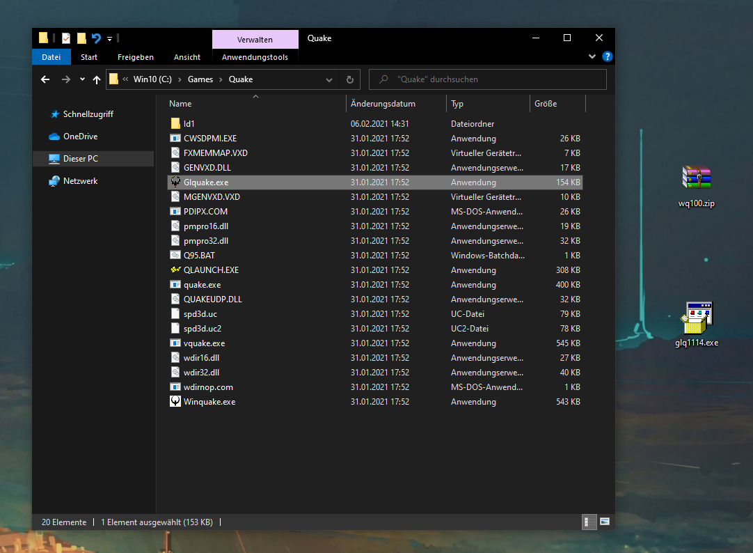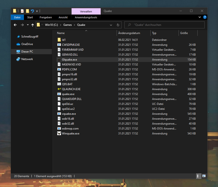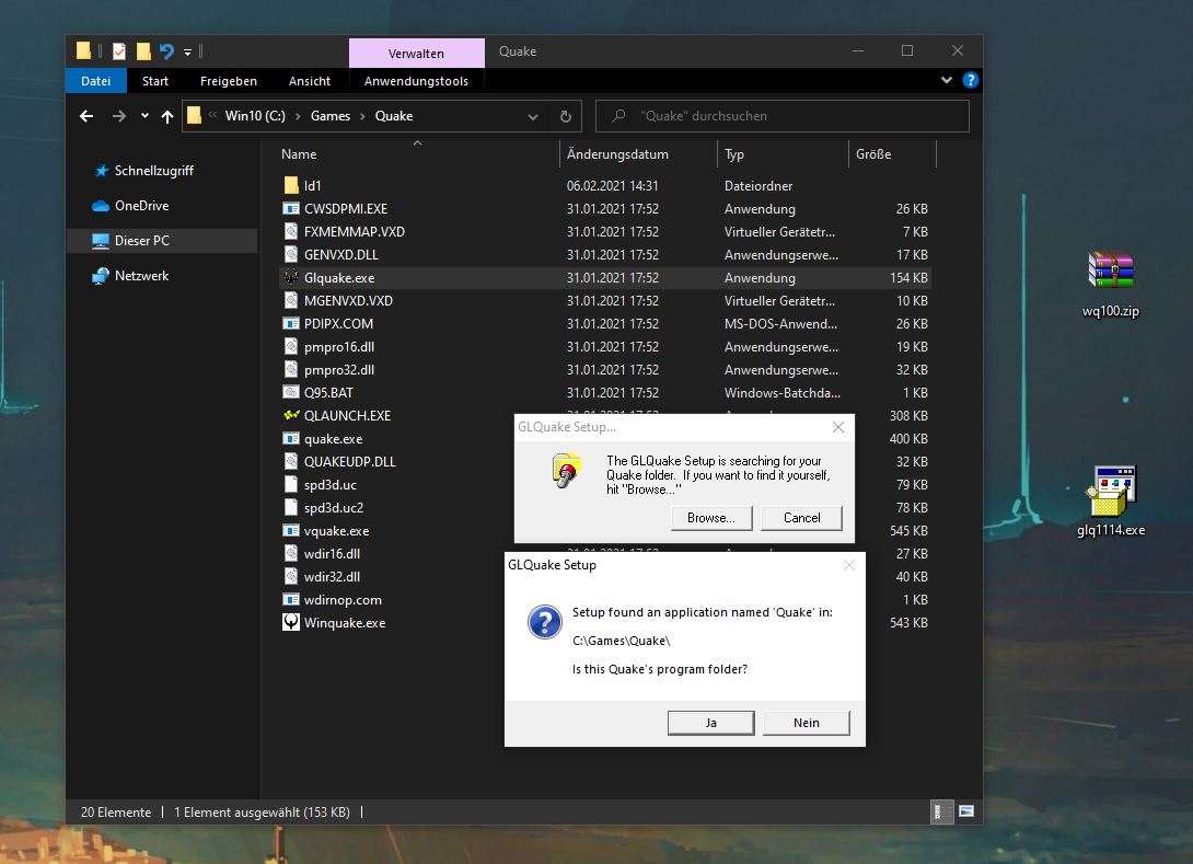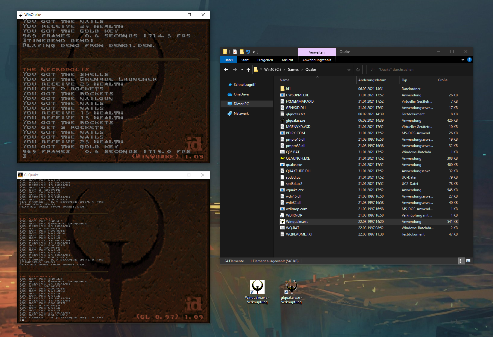 Für GLQuake unter Win10 muss die OpenGL32.dll aus dem Verzeichnis gelöscht / umbenannt werden, wenn diese vorhanden ist. Im Original heißt es dazu: