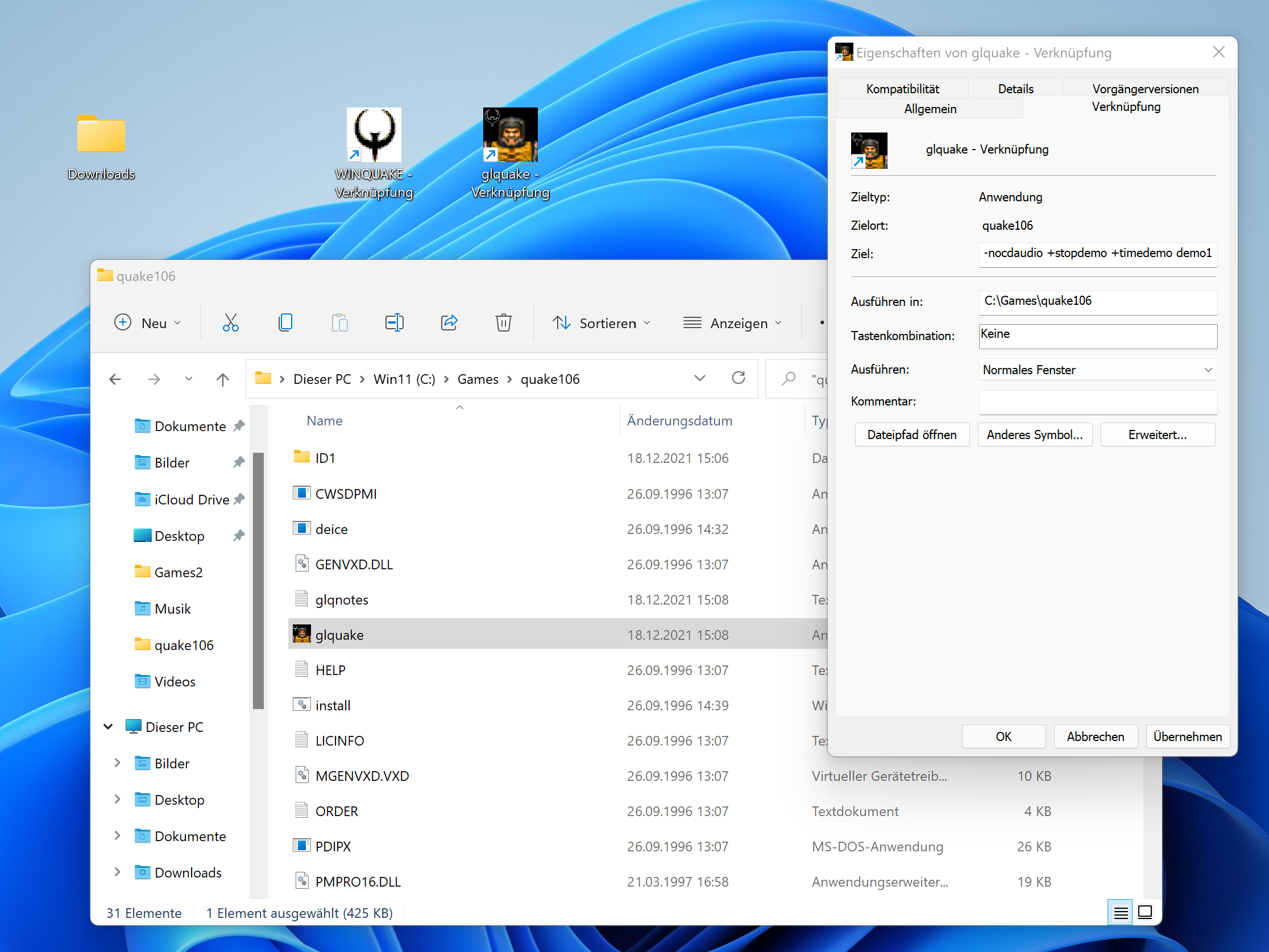 Der 1. Eintrag (Quake spielen) ist WinQuake, GLQuake dagegen ist der 3. Eintrag, um jetzt nicht bei jeder Version die Befehle verändern zu müssen, kann man auch die Befehle für WinQuake und GLQuake miteinander verknüpfen.