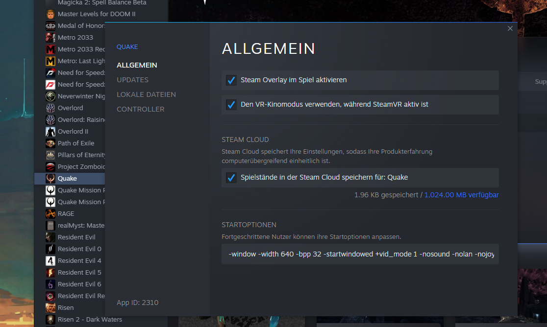Ist das alles erledigt kann man nach einer Verknüpfung auf Desktop, die Befehle aus der Codezeile ganz normal nutzen und Steam ist nicht mehr notwendig zum Starten. Unter Steam kann man Quake dann wieder ganz normal zum Spielen weiter nutzen.