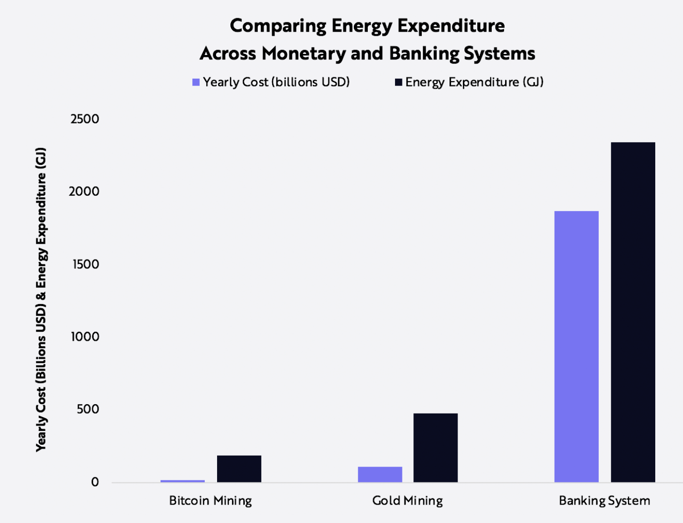 Wenn ich die Grafik und die Quelle (https://danhedl.medium.com/pow-is-efficient-aa3d442754d3) dahinter richtig verstehe, ist die Aussage, dass Bitcoin-Mining um das Jahr 2018, etwa 183 Millionen GJ pro Jahr verbraucht hat. Dies wird dann mit dem Verbrauch für Goldschürfen und dem gesamten Bankensystem verglichen.