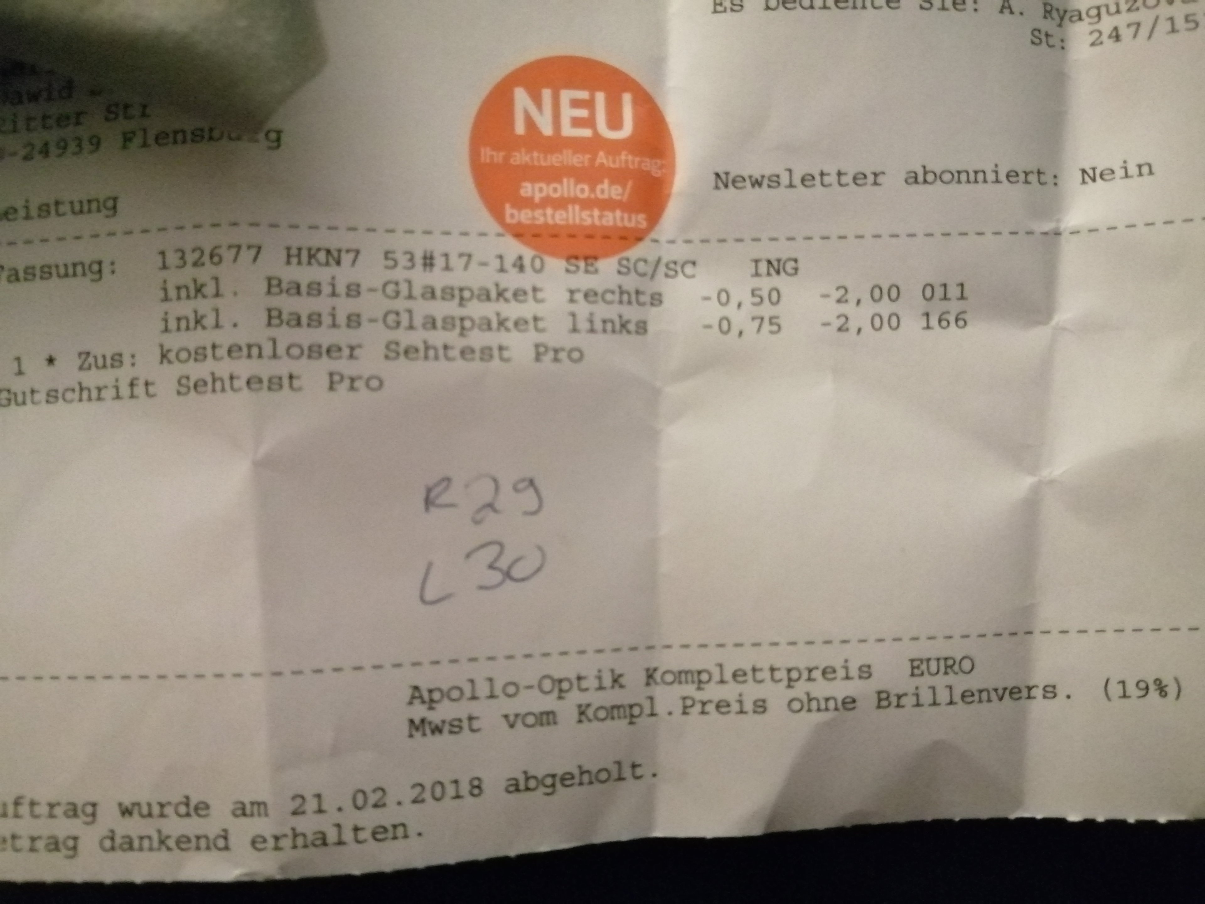 Man hat mir diese Werte fĂŒr die Pupillendistanz aufgeschrieben: R29, L30