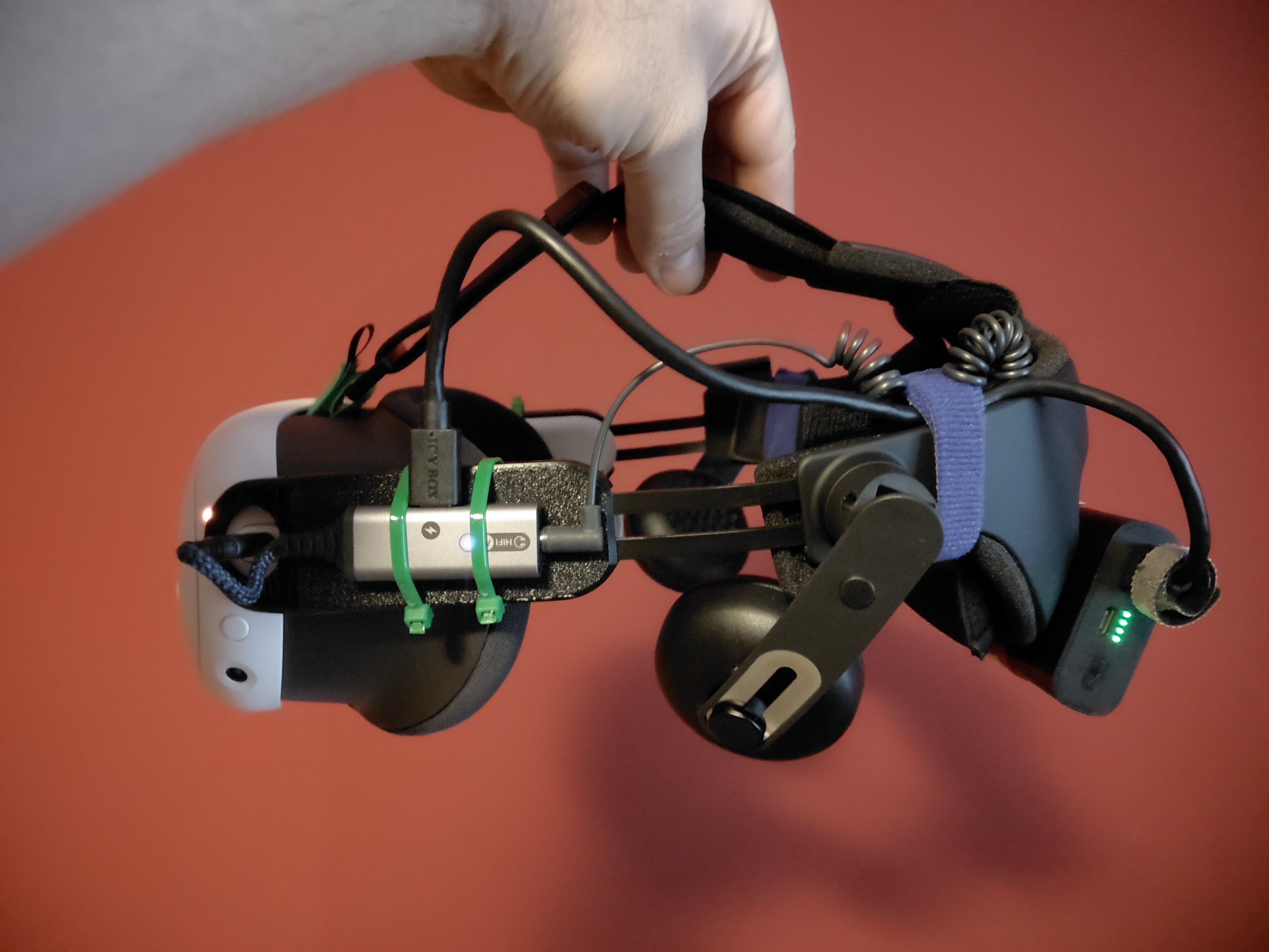 Das Problem mit dem Audio-Anschluss auf der "falschen" Seite des "DAS" habe ich übrigens ganz kreativ gelöst, indem ich einfach den DAC, welchen ich ursprünglich an meiner Pico 4 im Einsatz hatte, hier weiter verwende. So schlage ich zwei Fliegen mit einer Klappe: ich "schone" den USB-Anschluss der Quest 3 und muss das Audio-Kabel nicht umverlegen.