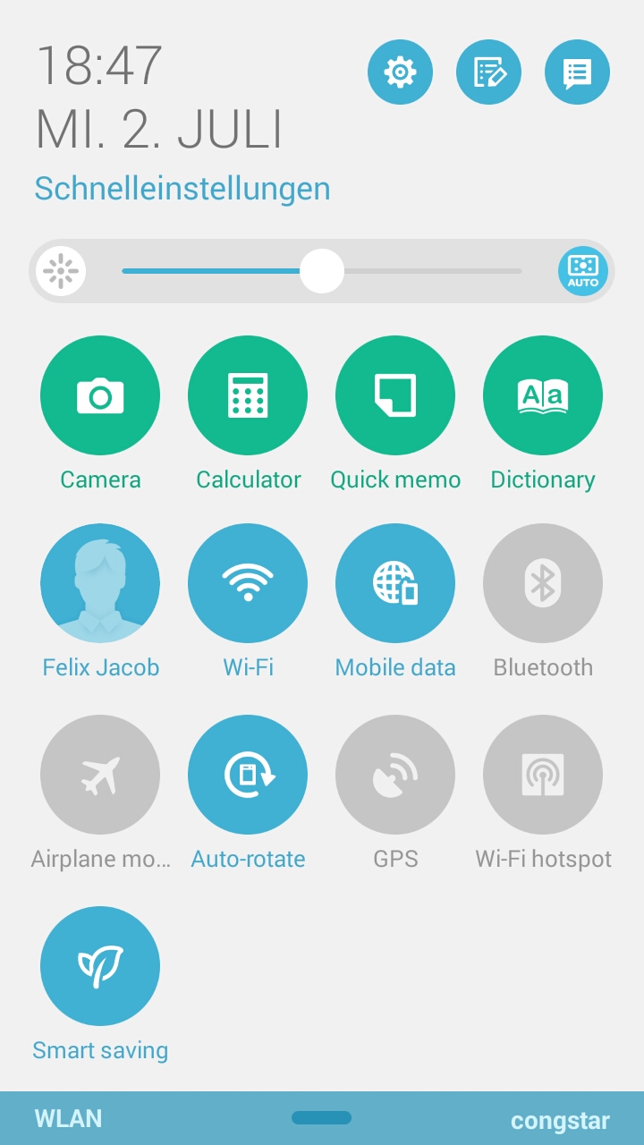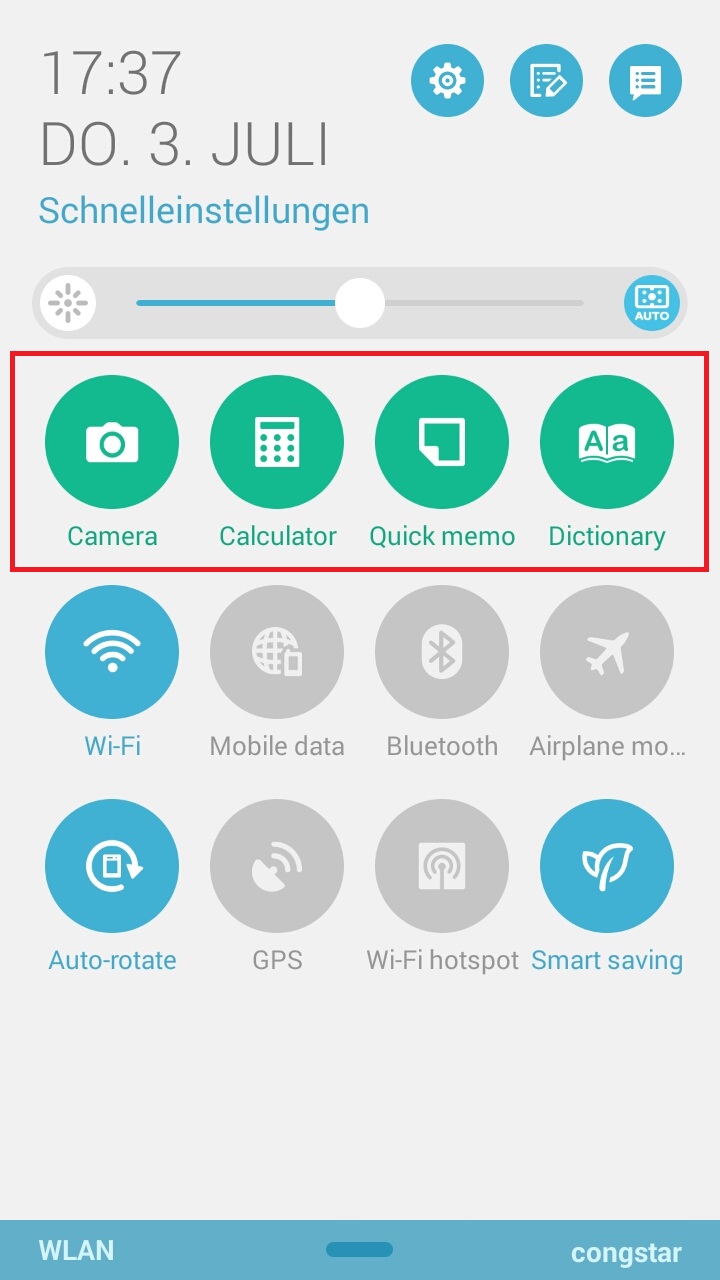 In den Schnelleinstellungen gibt es neben den Einstellungen auch vier "Quick-Apps", nämlich Camera, Calculator, Quick Memo & Dictionary.