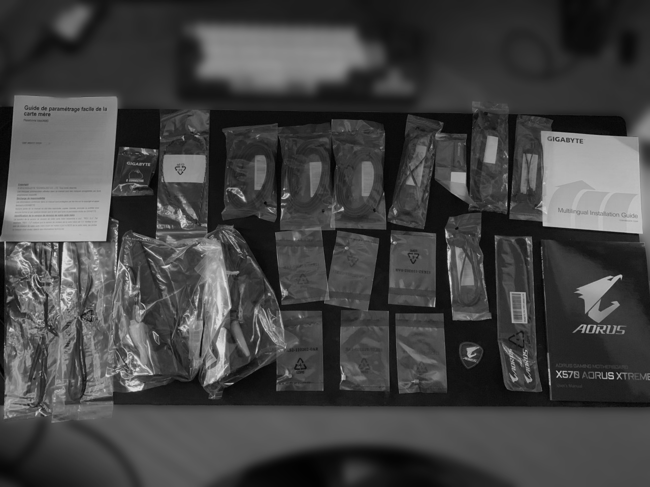 Neben der FAN COMMANDER Box findet sich eine weitere Box im Lieferumfang, die gängiges Anschlussmaterial für das Motherboard liefert. Neben sechs SATA-Kabeln (alle schwarz gesleevt; 3x 90° Winkel; 3x gerade) finden sich auch hier weitere zwei Temperaturfühler und Klettverschlüsse vor. Hinzu kommen noch Verlängerungskabel für RGB-Devices, Befestigungsmaterial für M2 SSDs, WLAN-Antennen, ein Manual, etwas Rechtssprache zu Garantieansprüchen, GIGABYTEs G-Connector und - das habe ich schon lange nicht mehr gesehen - ein Beeper zur akustischen Fehleranalyse.