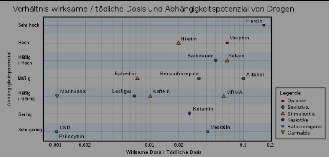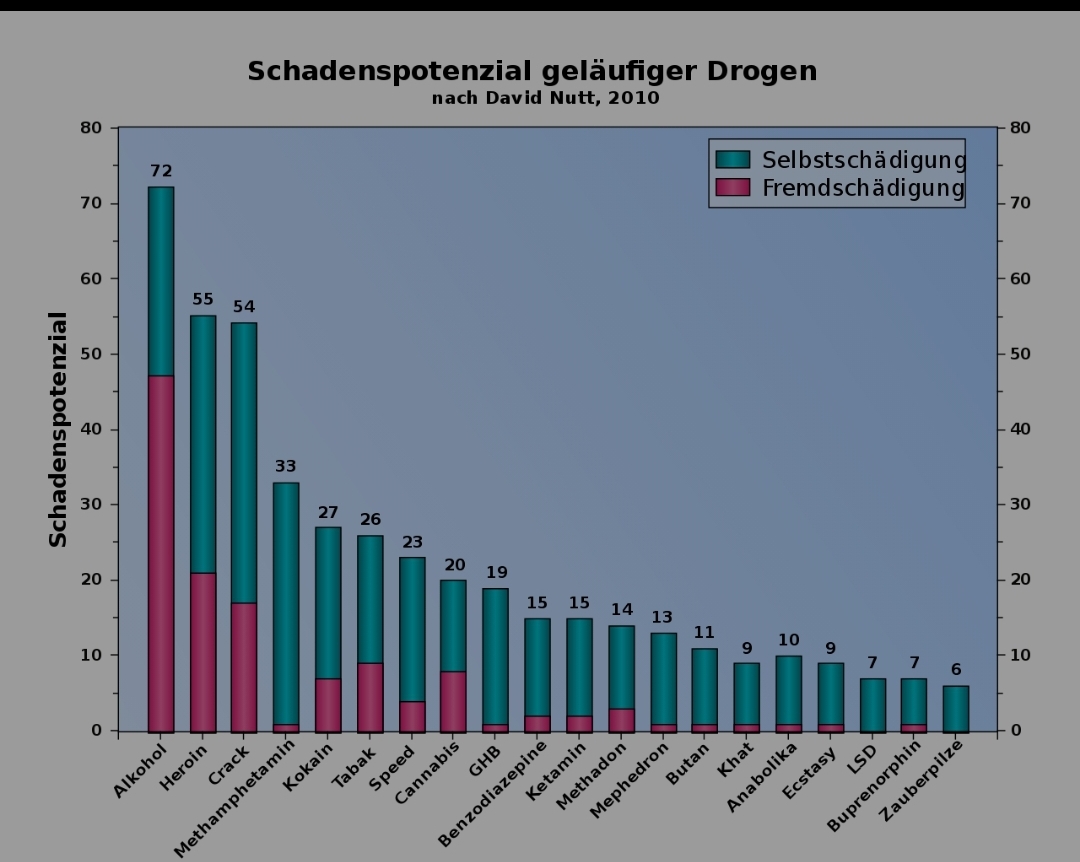 Wird bei Alkohol von jeder Studie (auch global betrachtet) höher eingestuft, als bei Heroin und Crack ... vor allem die Fremdschädigung ist bei Alkohol so hoch angesetzt, dass man dafür eigentlich eine extra Kategorie bräuchte. Es ist egal, wer da eine Studie anfertigt ... Alk ist immer der Spitzenreiter bei Fremd- und Selbstschädigung. Da hält keine illegale Droge mit.