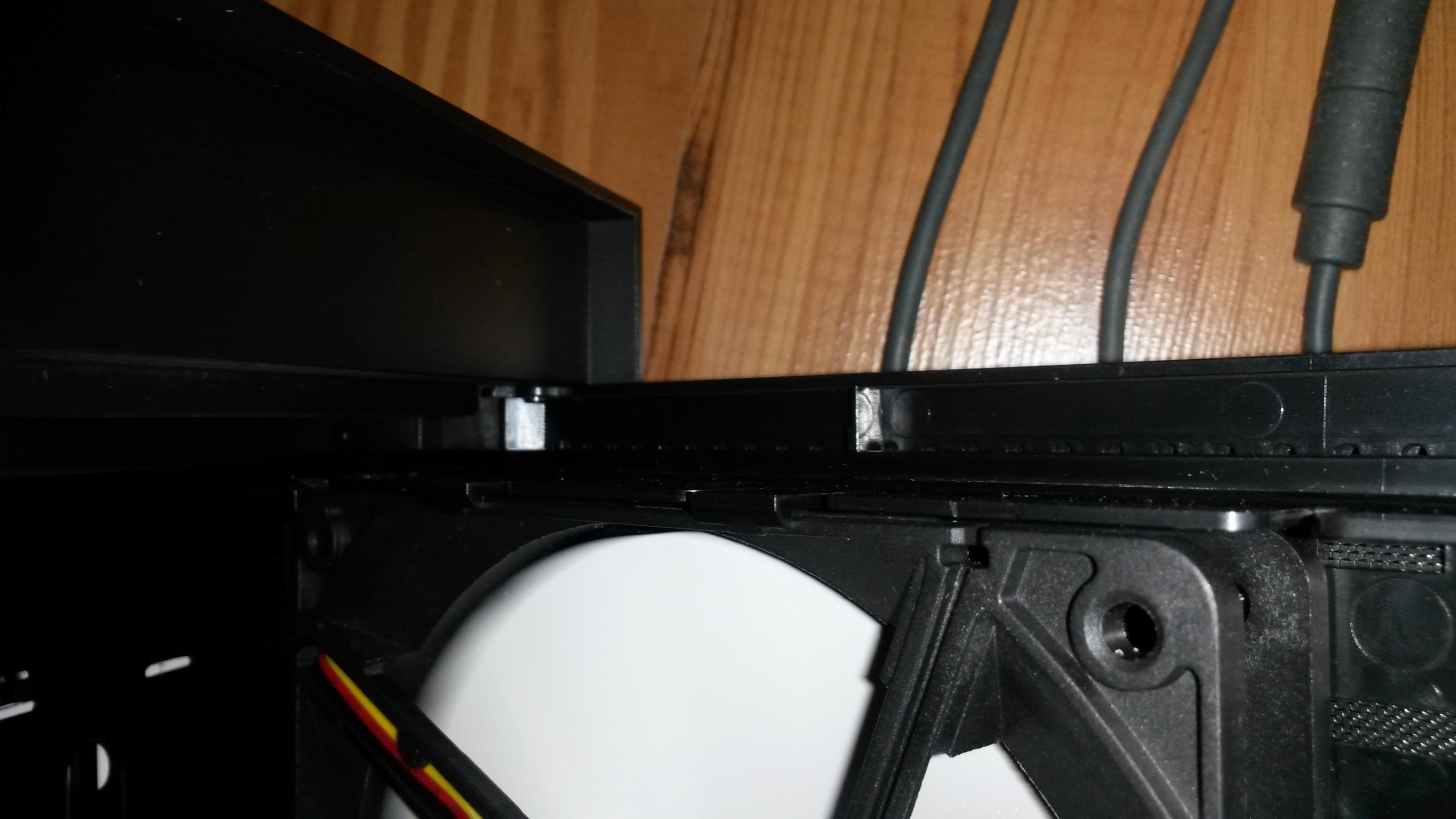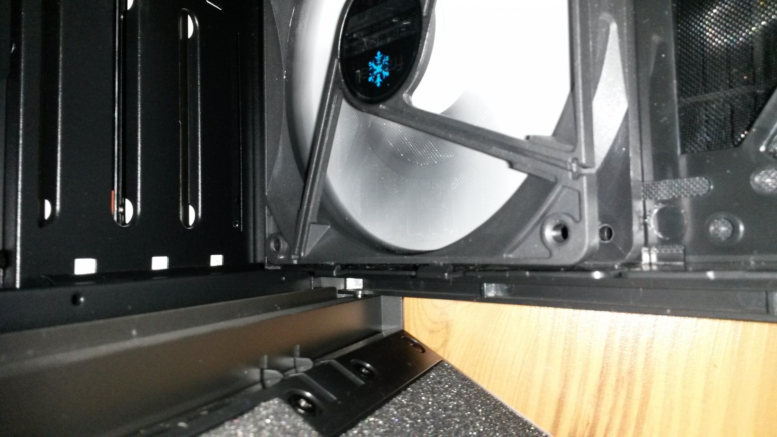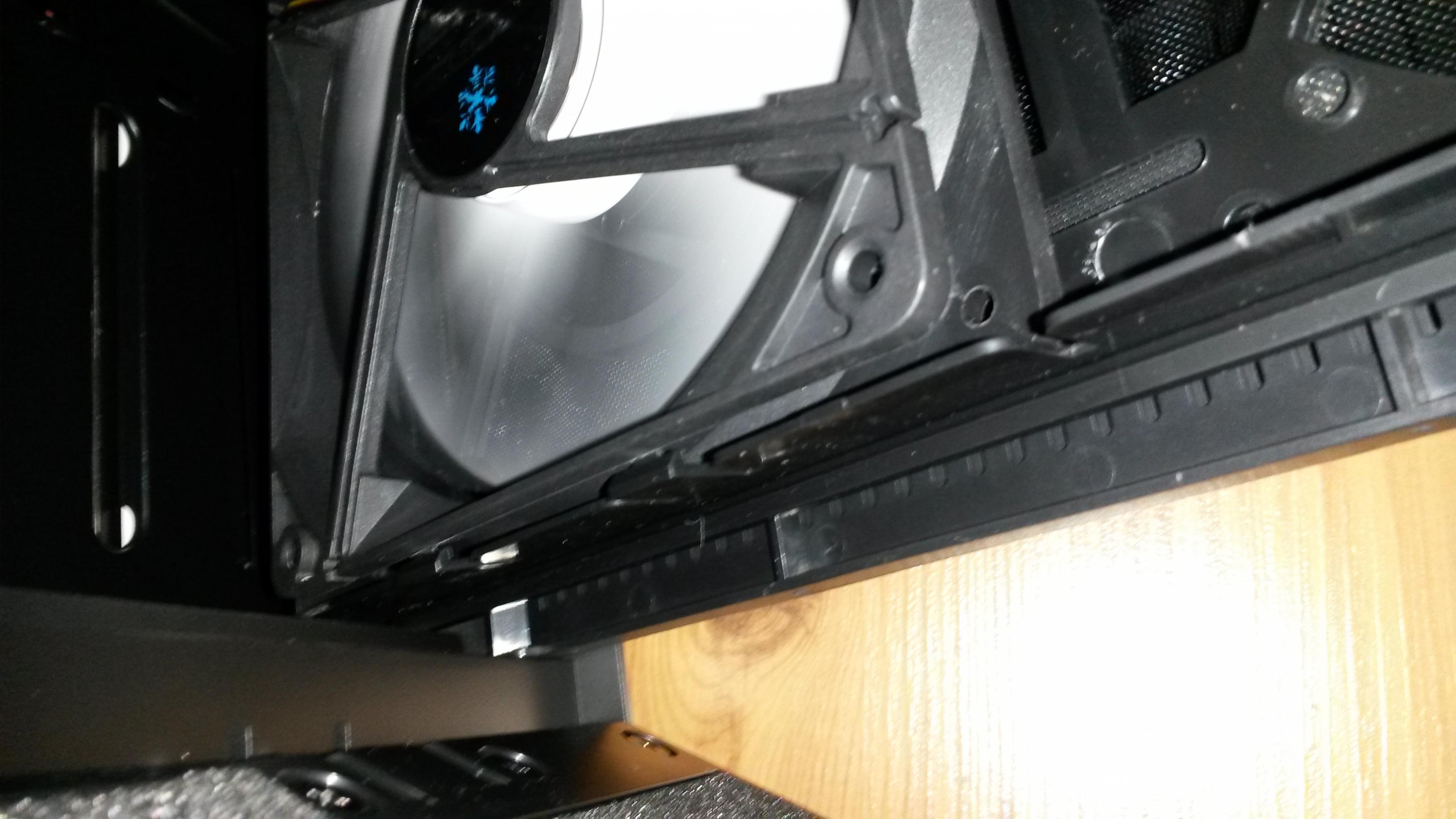 die Front-Fan-Halterung hält auf der einen Seite den Lüfter nicht richtig fest - hier klaffts ein wenig, der Lüfter ist dadurch fast nur noch Halbseitig befestigt