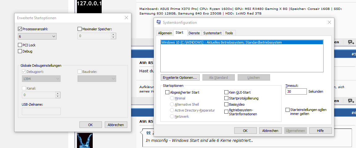 In msconfig - Windows Start sind alle 6 Kerne registriert..