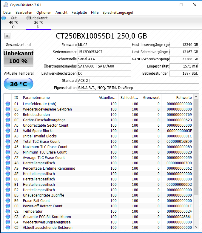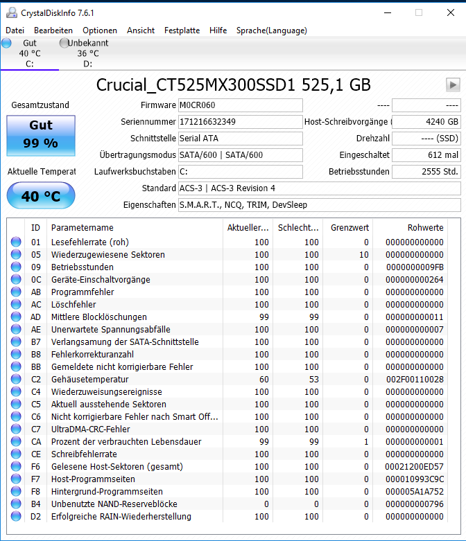 Als ich eben per Crystal Disk meine Platten checken wollte, hatte die CT525MX300 plötzlich stand 100% nur noch 99% Gesamtzustand. (die 250GB Platte stand schon beim alten PC immer auf 100% Unbekannt)