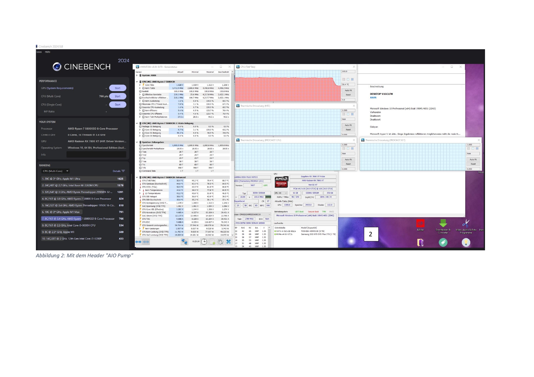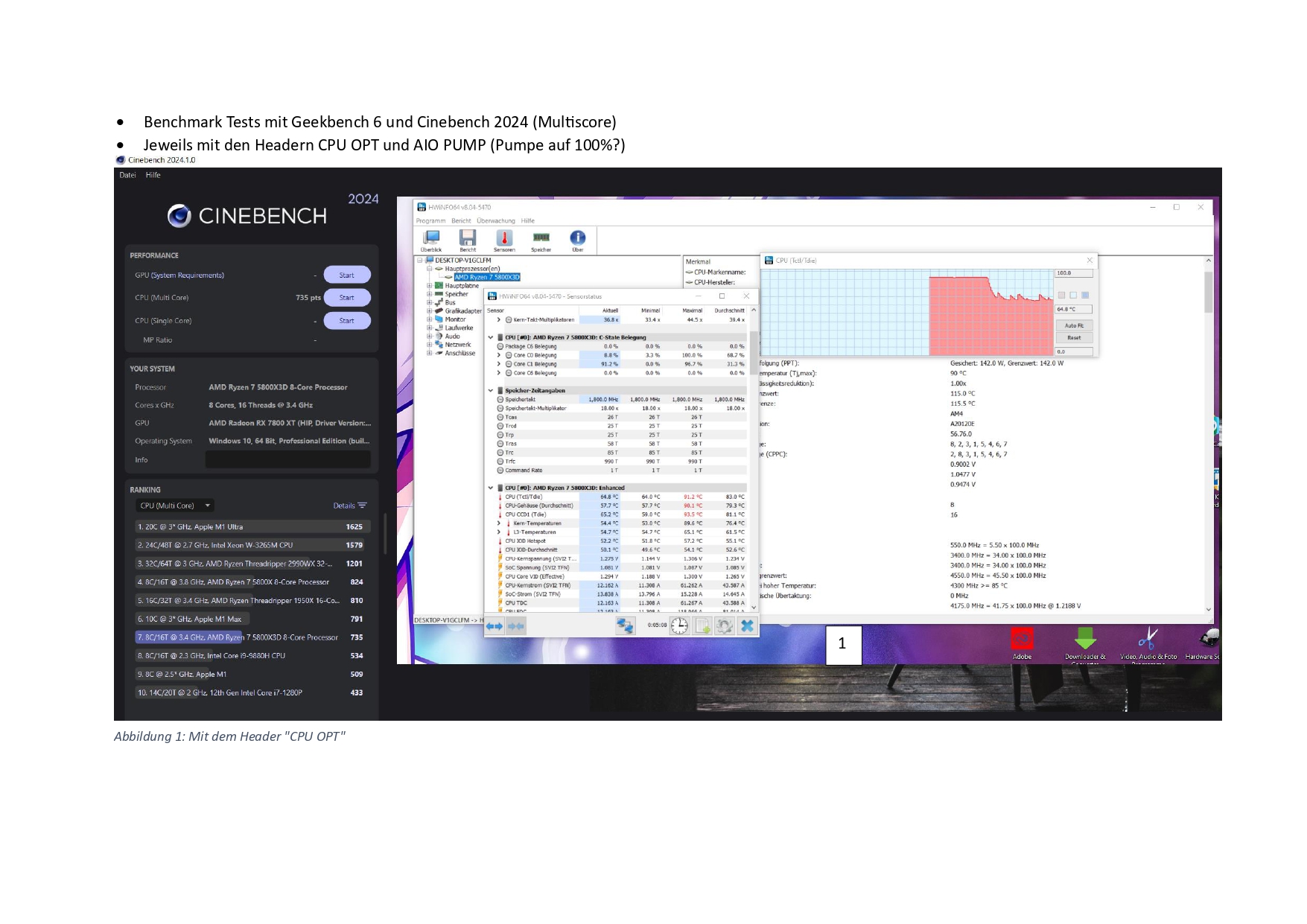 - Unter Last mit Cinebench erreicht die CPU 80°C, wobei die Pumpe auf 100% gestellt war (provisorisch).