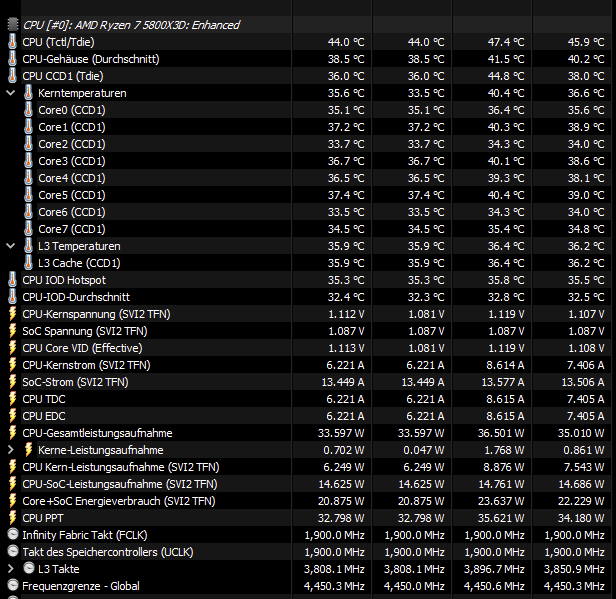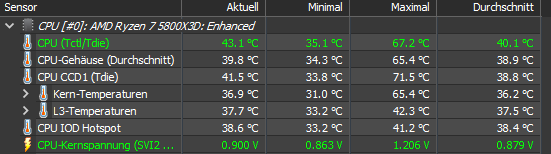 Das ist mein 5800X3D unter Luft ( NH-D15 SE ) mit 30°C Raumtemperatur und nebenher läuft Download + Installation von Witcher 3 via Steam und ein Twitch Stream in 1080p + 4 weitere Browsertabs, die auch genutzt werden. Also es wird neben dem laufenden Benchmark noch dran gearbeitet.