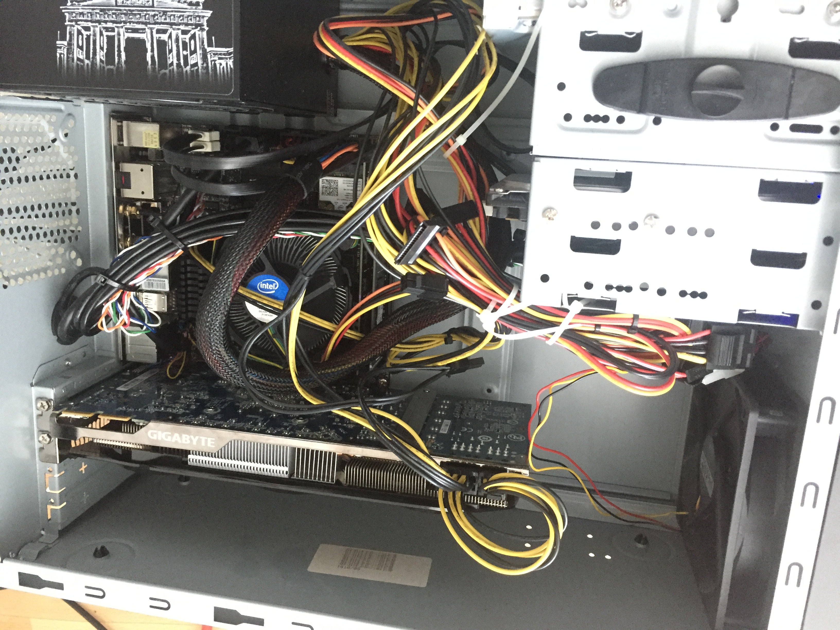 Naja, ist halt ein Eigenbau.Das Board ist ein Mini-iTX-Format. Die Graka ist deutlich länger als das Board. Der Tower ist auch nicht das Beste. Die Karte sitzt auch nicht bombenfest drin. Man kann sie wackeln, da die Karte im Slot nicht rastet.