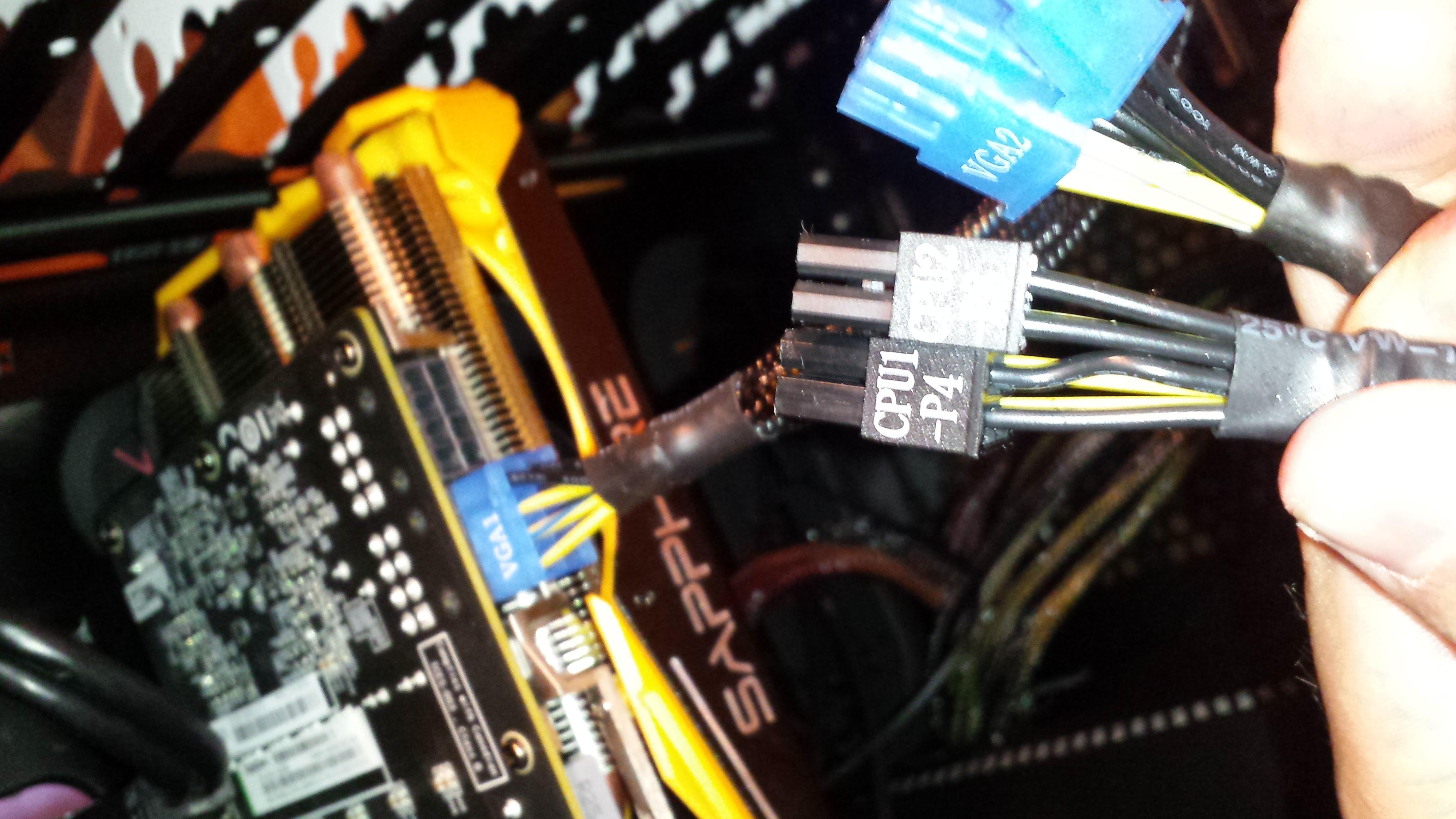 Habe heute das ersten mal meinen eigenen pc zusammengebaut. Lief auch gut, hätte ich nicht gedacht. Allerdings komm ich mit dem Anschluss der gpu nicht weiter. Habe 2 4x2 oder 1x8 pins (keine Ahnung wie die genaue Bezeichnung ist und einen vga 1 und vga 2 Anschluss. Ausserdem einen cpu 1 p4 und einen cpu 2 p8 Anschluss. Habe mal ein bild zur veranschaulichung. Hoffe ihr könnt mir helfen.